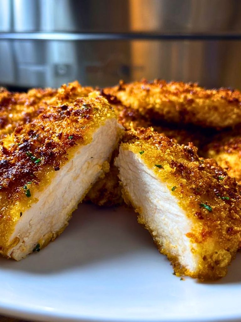 Das Geheimnis liegt in der Panade und der richtigen Temperatur. Maispaniermehl oder glutenfreie Semmelbrösel sorgen für eine krosse Textur, während etwas Öl das Bräunen fördert. Achte darauf, die Hähnchenfilets nicht zu dick zu panieren, damit sie im Airfryer rundum knusprig werden und das Fleisch innen saftig bleibt.
