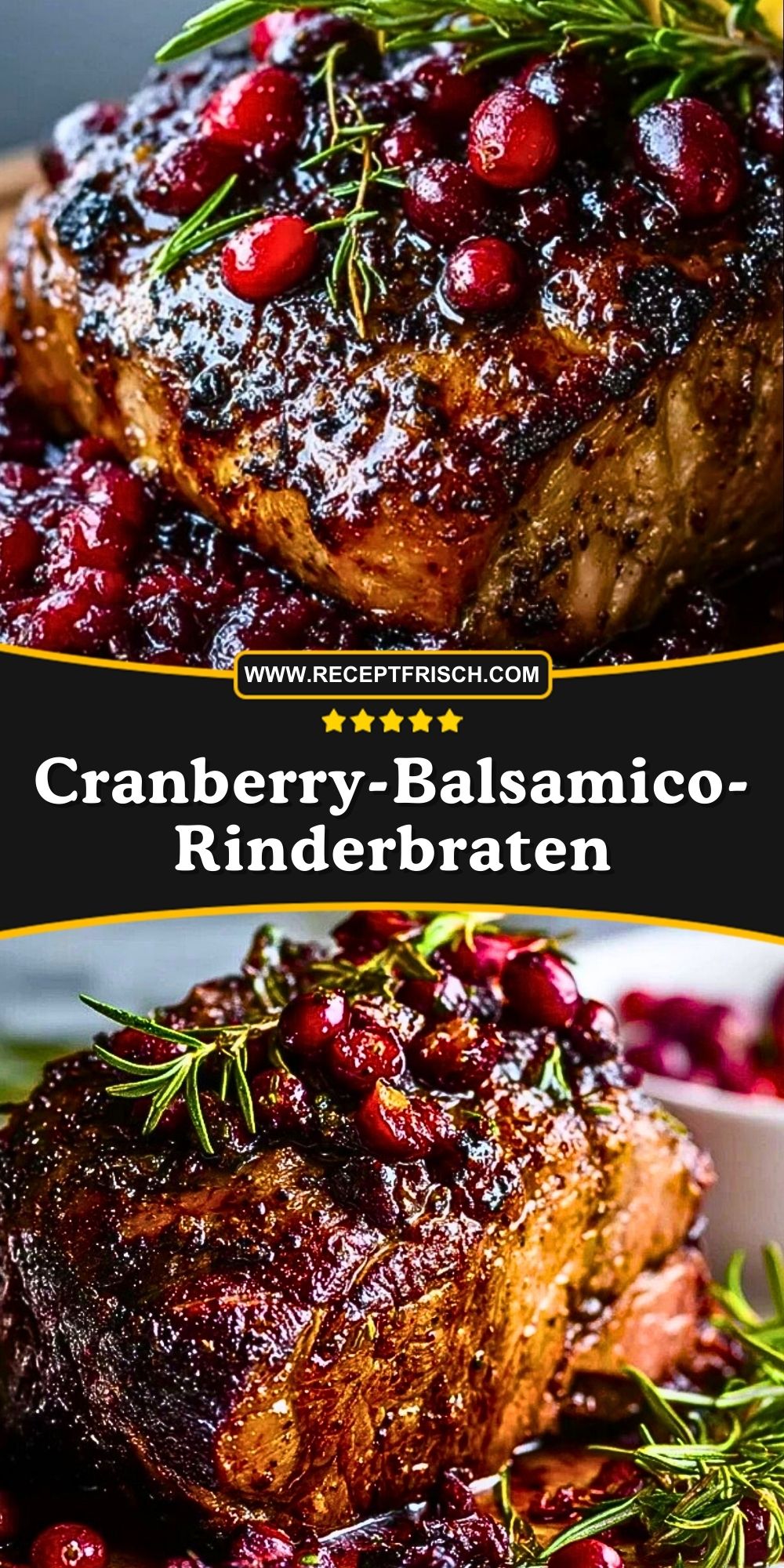 Ein festlicher Cranberry-Balsamico-Rinderbraten: Saftiges Rindfleisch schmort langsam in einer fruchtigen Sauce aus Cranberries, Balsamico-Essig, Honig und frischem Rosmarin. Perfekt für besondere Anlässe und gemütliche Familientreffen.