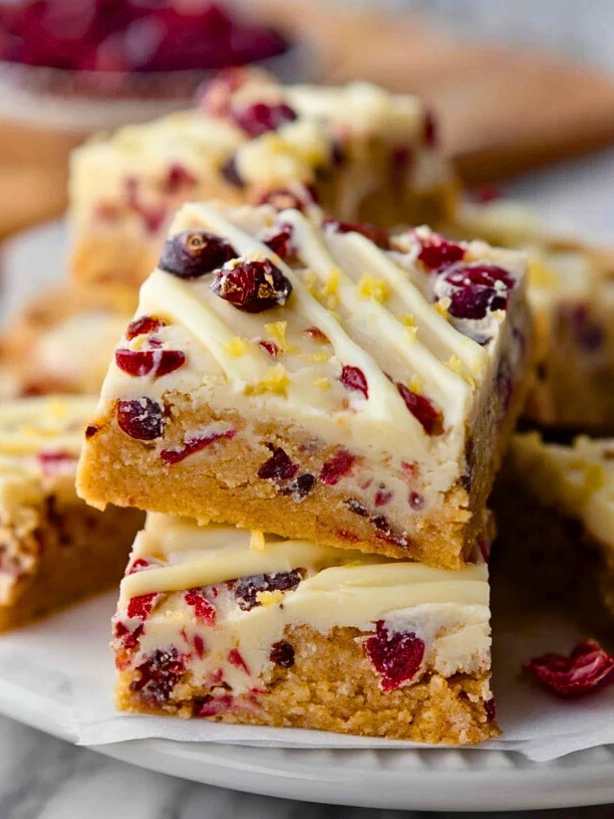 Diese Cranberry Bliss Riegel bestehen aus einem saftigen Blondie-Boden mit weißer Schokolade und fruchtigen Cranberries, verfeinert mit Orangenschale. Gekrönt werden sie von einem cremigen Frischkäse-Frosting und einer dekorativen weißen Schokoladenglasur.