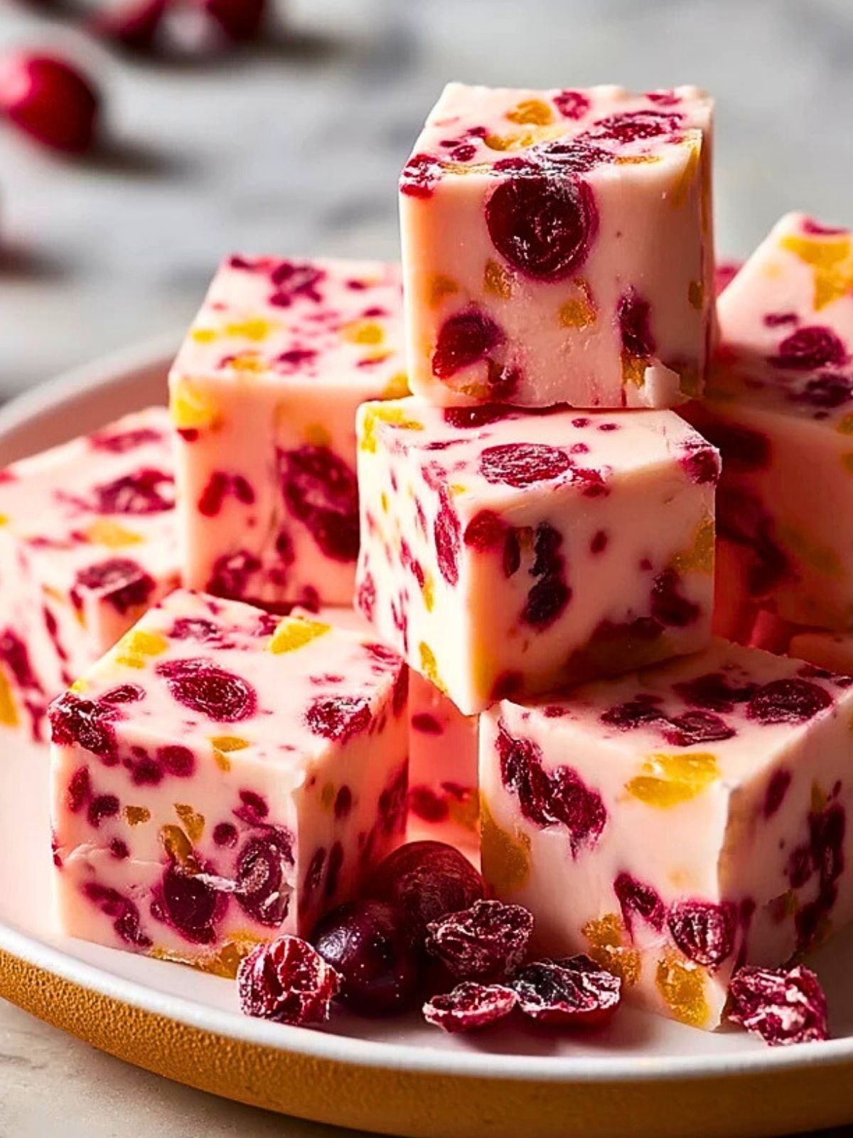 Dieses cremige Cranberry-Orange-Fudge ist ein fruchtig-süßer Genuss, der ganz ohne Backen auskommt. Weiße Schokolade, getrocknete Cranberries und frische Orangenzesten machen dieses Rezept zu einem festlichen Highlight auf jedem Plätzchenteller. Ideal zum Verschenken oder selbst Genießen!