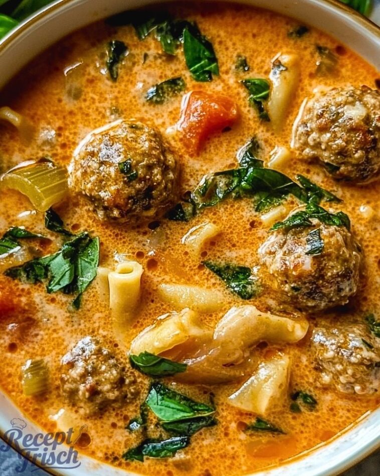 Cremige Italienische Fleischbällchen-Suppe ist eines dieser Gerichte, die sofort ein Gefühl von Gemütlichkeit und Genuss vermitteln. Ich liebe es, wie sich die Aromen von herzhaften Fleischbällchen, cremiger Tomatenbrühe und duftenden Kräutern perfekt miteinander verbinden. Die Kombination aus saftigen Hackbällchen, zarten Nudeln und einer aromatischen, leicht würzigen Suppe macht dieses Rezept zu einem echten Wohlfühlessen. Besonders an kalten Tagen gibt es kaum etwas Besseres als eine warme Schüssel dieser köstlichen Suppe.