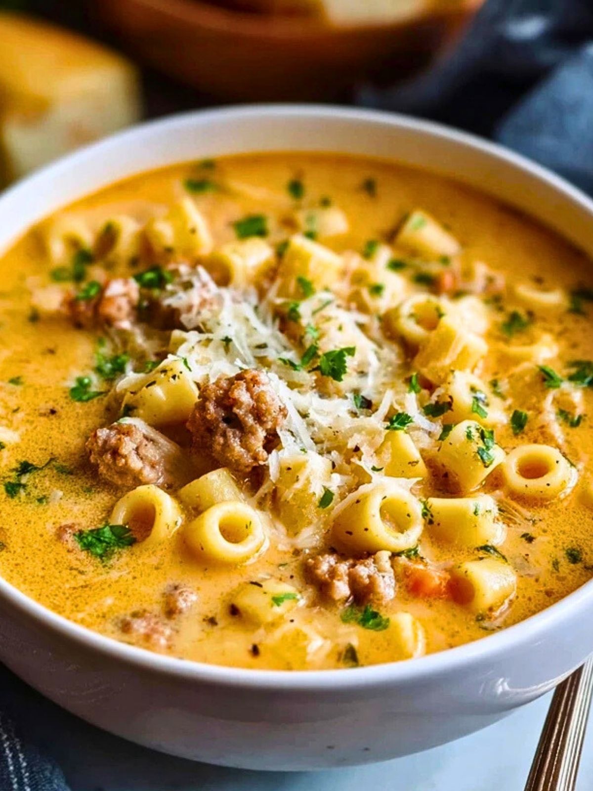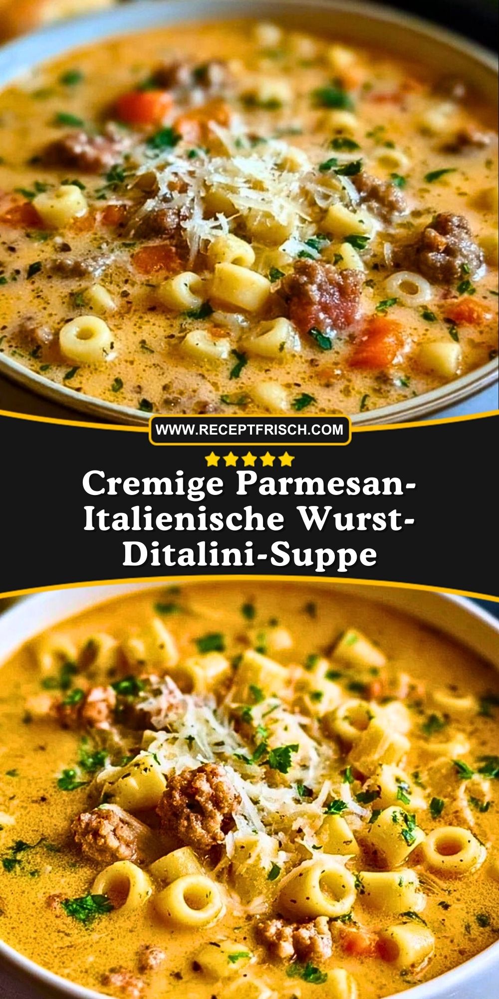 Diese cremige Parmesan-Italienische Wurst-Ditalini-Suppe ist ein echtes Wohlfühlgericht. Saftige italienische Bratwurst, zartes Gemüse, kleine Ditalini-Nudeln und eine samtige Parmesan-Sahne-Brühe verschmelzen zu einer sättigenden, aromatischen Suppe – perfekt für kalte Tage, schnelle Familienküche oder Gäste.