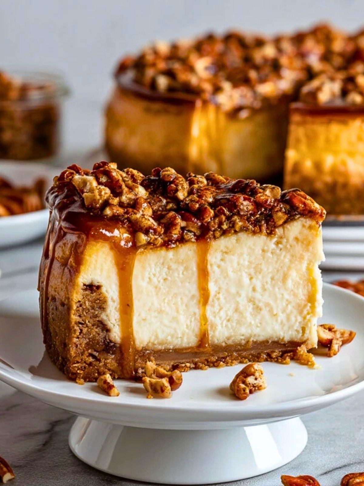 Ein cremiger Käsekuchen auf knusprigem Keksboden, gekrönt von gerösteten Pekannüssen in einer goldenen Karamellschicht – ein echter Hingucker auf jeder Kaffeetafel und das perfekte Dessert für alle Nussliebhaber.