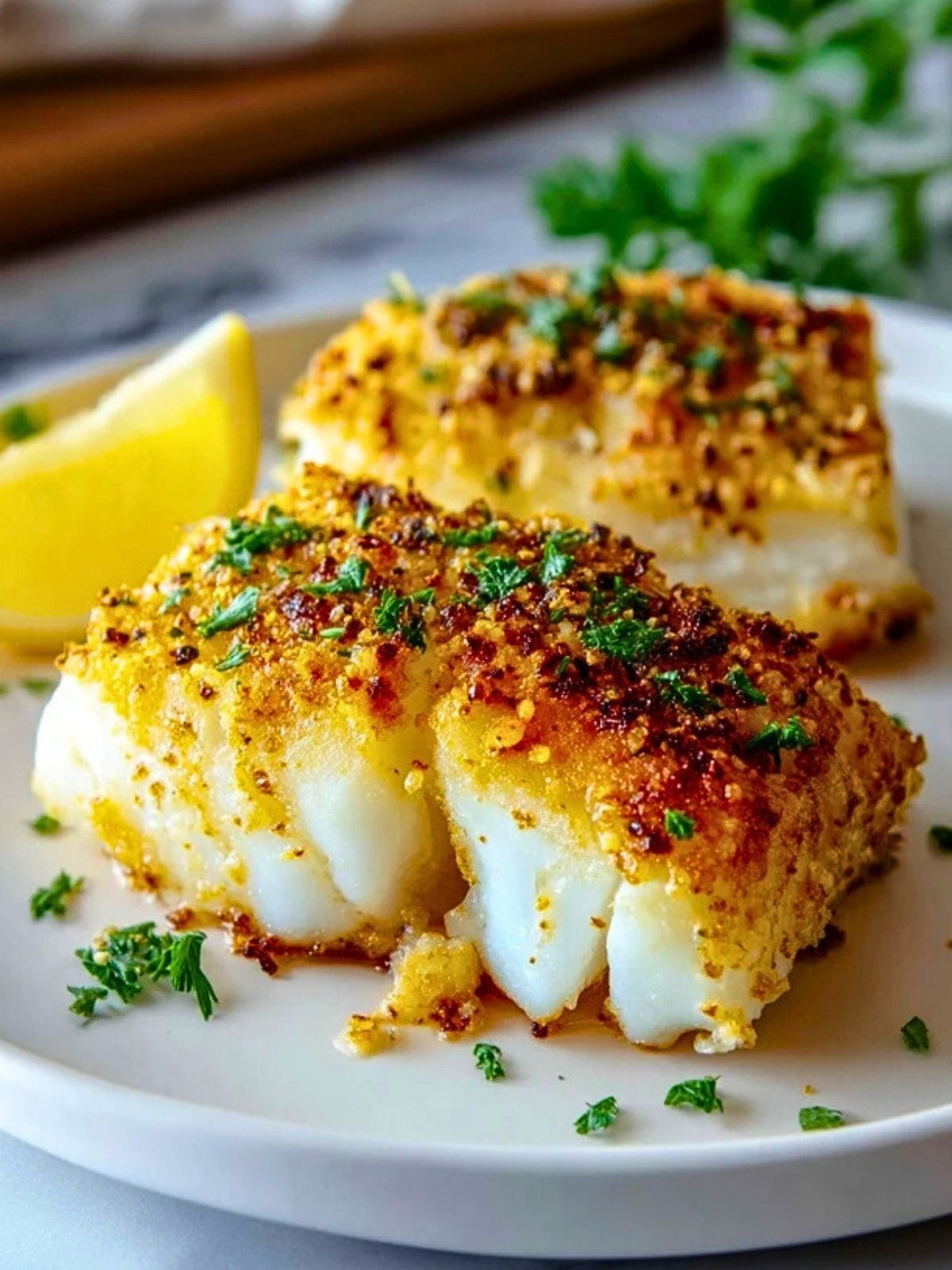 7. Kabeljau herausnehmen, mit frischer Petersilie bestreuen und mit Zitronenspalten servieren.