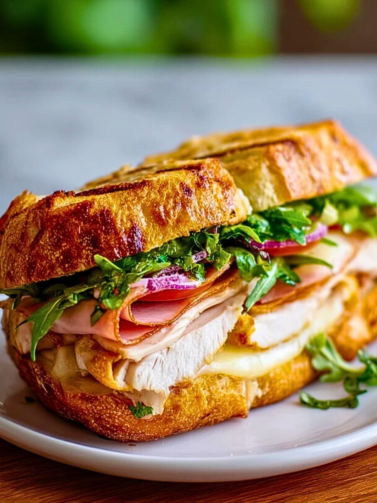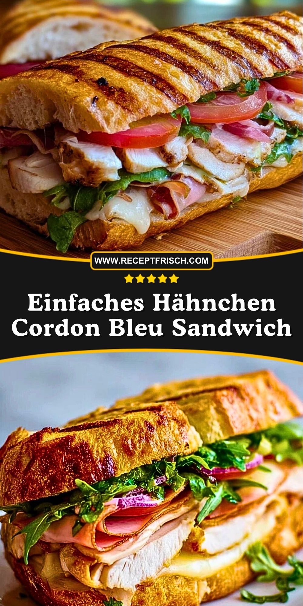 Ein warmes, knuspriges Sandwich mit zartem Hähnchenbrustfilet, würzigem Schinken, schmelzendem Käse und frischem Salat im ofenfrischen Baguette – ein Genuss wie im Bistro! Dieses Hähnchen Cordon Bleu Sandwich vereint die Aromen des Klassikers mit der schnellen Zubereitung eines Sandwiches. Perfekt für ein herzhaftes Mittagessen oder den Snack zwischendurch.
