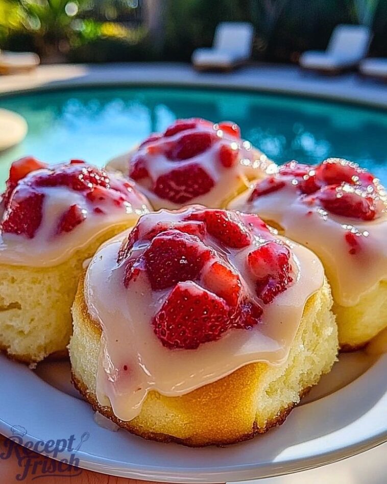 Erdbeer-Käsekuchen-Süßbrötchen sind die perfekte Kombination aus fluffigem Teig, cremigem Käsekuchen-Topping und fruchtigen Erdbeeren. Jedes dieser kleinen Gebäckstücke ist ein Genuss für sich – sie sind süß, saftig und wunderbar erfrischend. Ich liebe es, sie an warmen Sommertagen zu servieren, am besten frisch aus dem Kühlschrank, wenn die Creme leicht gekühlt ist.