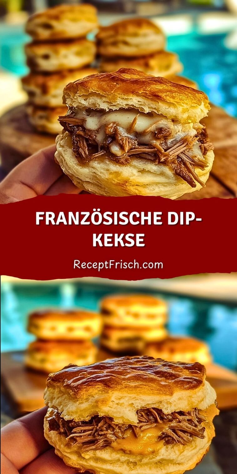 Französische Dip-Kekse sind ein absolutes Wohlfühlessen, das knusprige, butterige Kekse mit zart geschmortem Rindfleisch und geschmolzenem Käse kombiniert. Jedes Mal, wenn ich sie zubereite, duftet die Küche nach herzhaften Aromen, die an ein klassisches French-Dip-Sandwich erinnern – nur in einer handlichen, mundgerechten Version. Perfekt für Partys, gemütliche Abende oder als besondere Leckerei für die Familie.