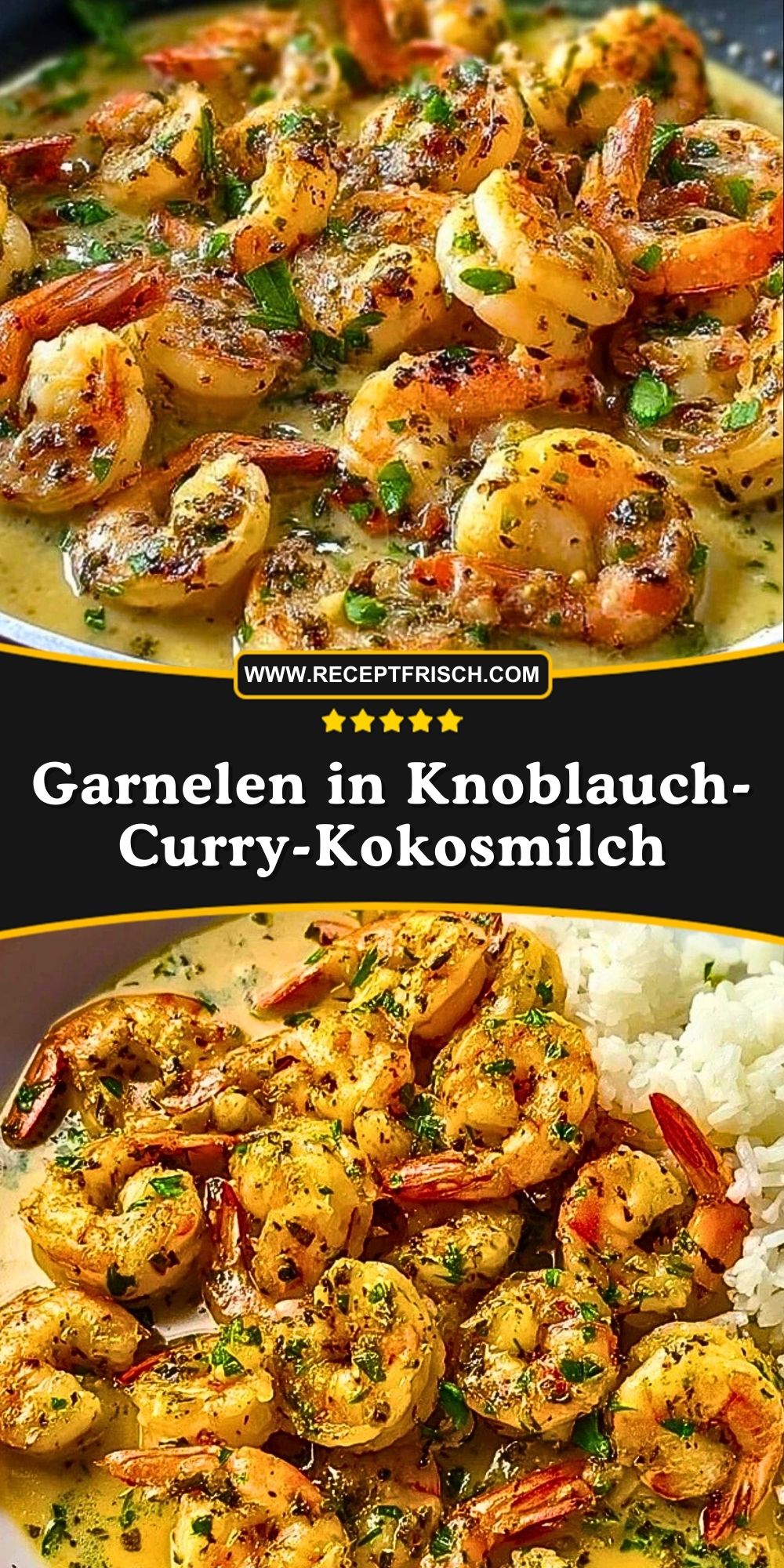 Zarte Garnelen treffen auf eine cremige Knoblauch-Curry-Kokosmilch-Sauce: Ein exotisches, schnelles Pfannengericht mit asiatischen Gewürzen, frischen Kräutern und viel Geschmack. Perfekt mit Reis oder Baguette!