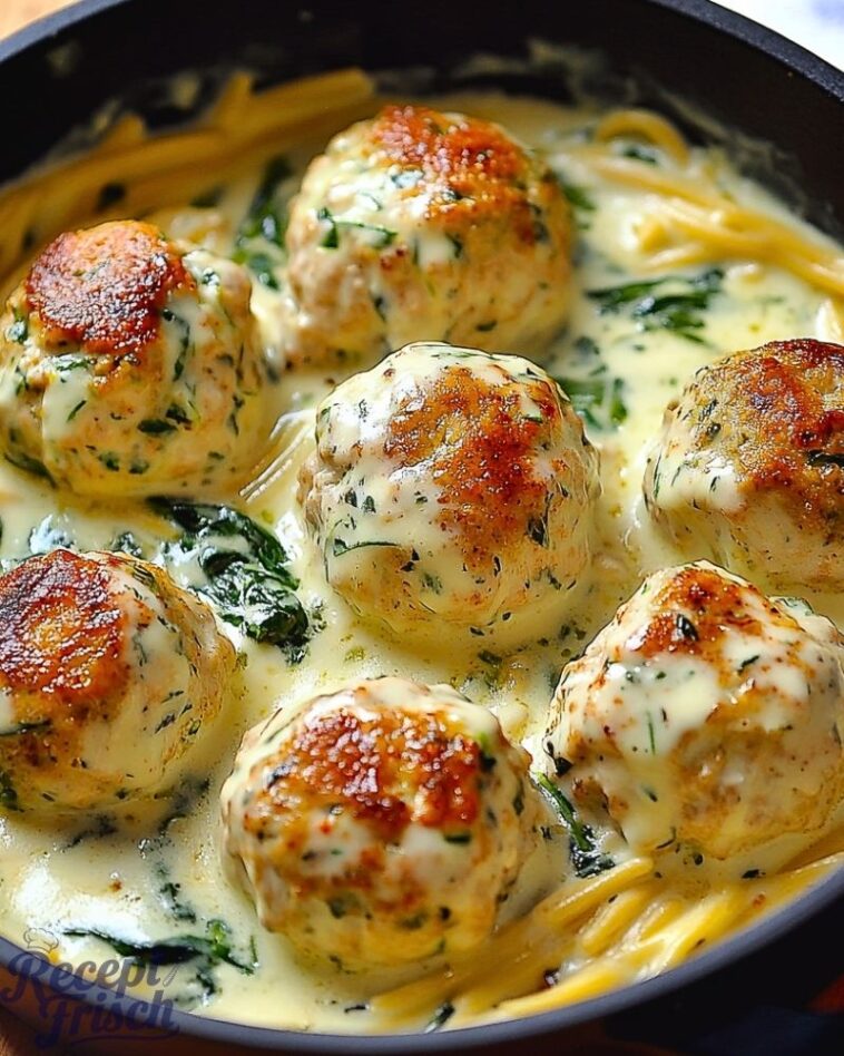 Gebackene Hähnchen-Ricotta-Fleischbällchen mit Spinat-Alfredo-Sauce