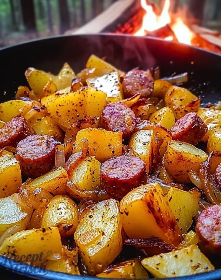Ob beim Camping, in der Küche oder auf dem Grill – dieses Rezept ist der ideale Begleiter für jede Mahlzeit. Die zarten Kartoffeln harmonieren perfekt mit der würzigen Wurst, und durch das Braten in der Pfanne erhält alles eine schöne goldene Kruste. In diesem Artikel werde ich euch zeigen, wie ihr dieses köstliche Gericht zubereitet und warum es der Hit auf jeder Feier oder beim Familienessen sein wird.