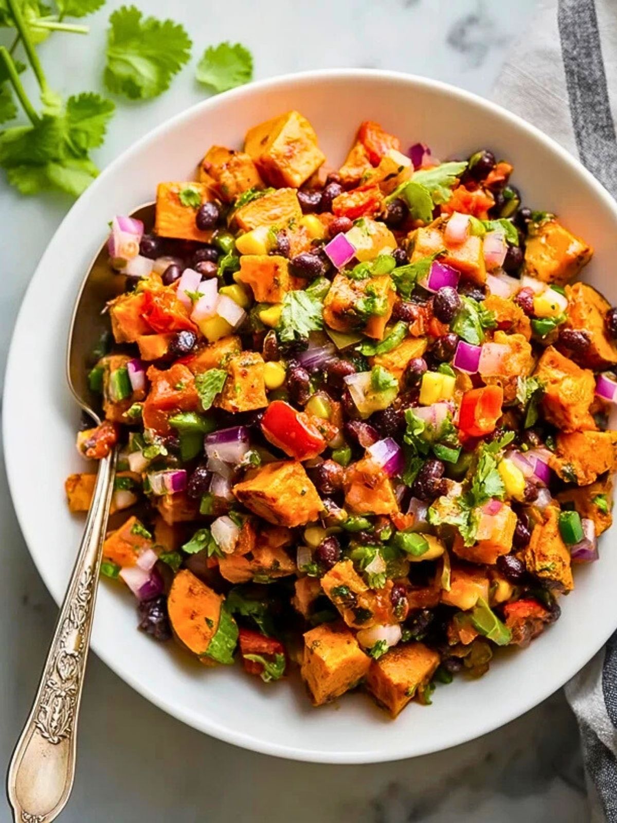 Dieser bunte Salat vereint geröstete Süßkartoffeln, proteinreiche schwarze Bohnen, knackigen Mais und frische Kräuter. Mit einem Limetten-Dressing ist er ein sommerlicher Genuss, sättigend, gesund und perfekt als Hauptgericht oder Beilage.