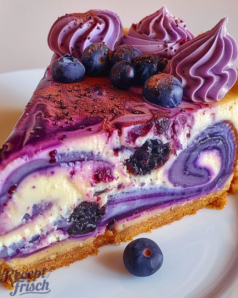 - Wunderschönes Muster: Der Heidelbeer-Swirl macht diesen Käsekuchen zu einem echten Hingucker.