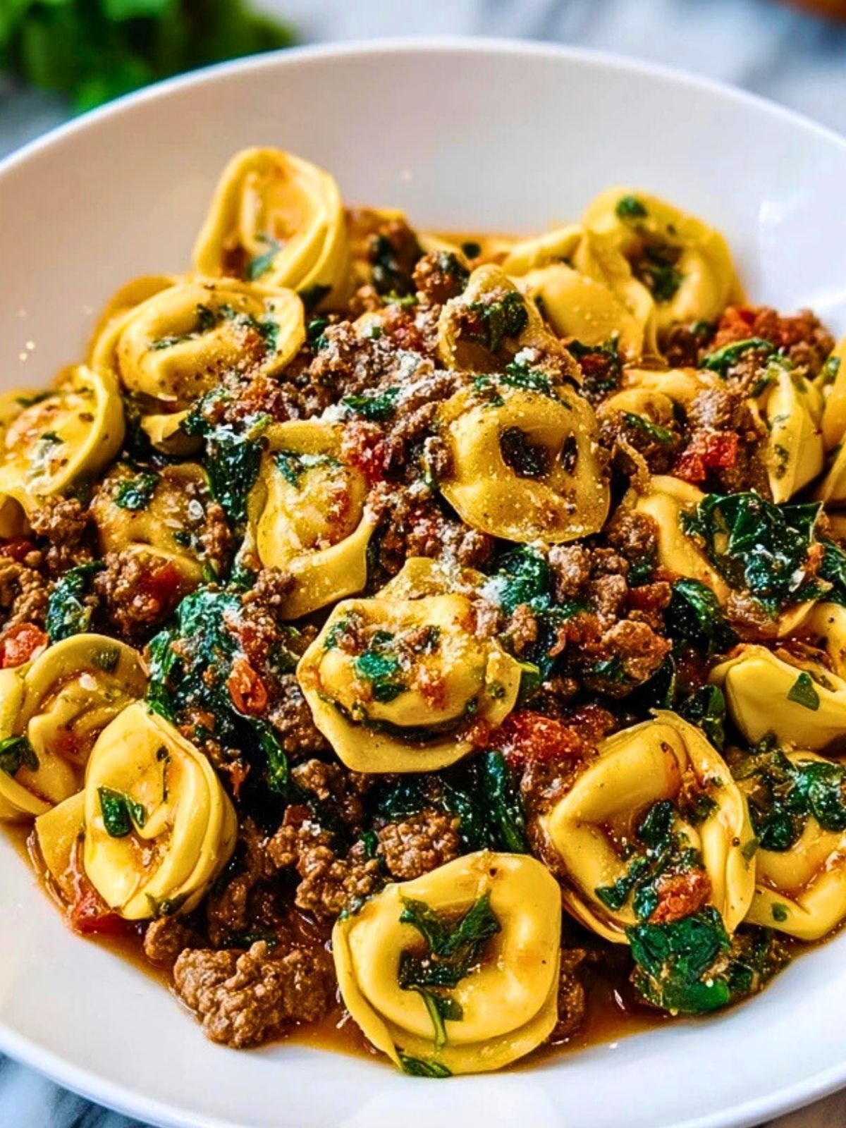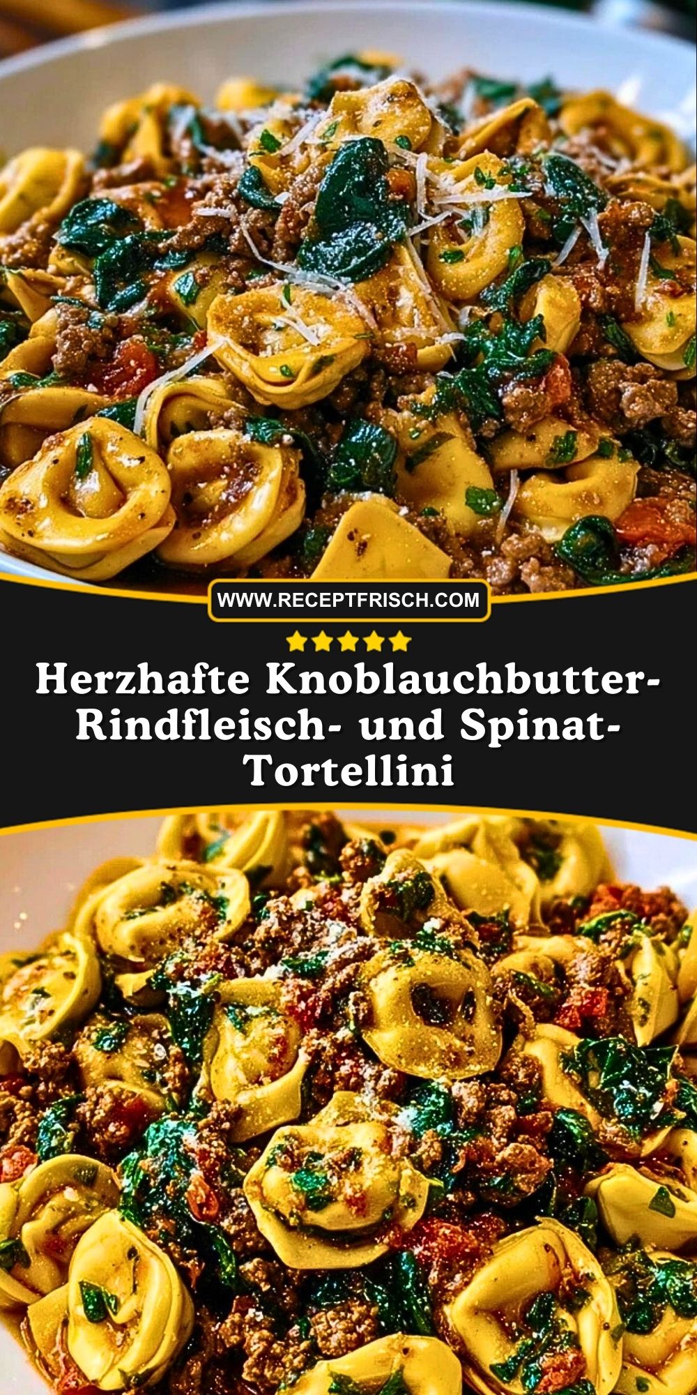 Cremig gefüllte Tortellini, gebettet in einer würzigen Knoblauchbutter, treffen auf herzhaftes Rinderhack und frischen Blattspinat – dieses Gericht verbindet italienischen Genuss mit rustikalem Wohlfühlcharakter. Jeder Bissen bringt die perfekte Balance zwischen zartem Pasta-Teig, aromatischem Fleisch und knackigem Grün.