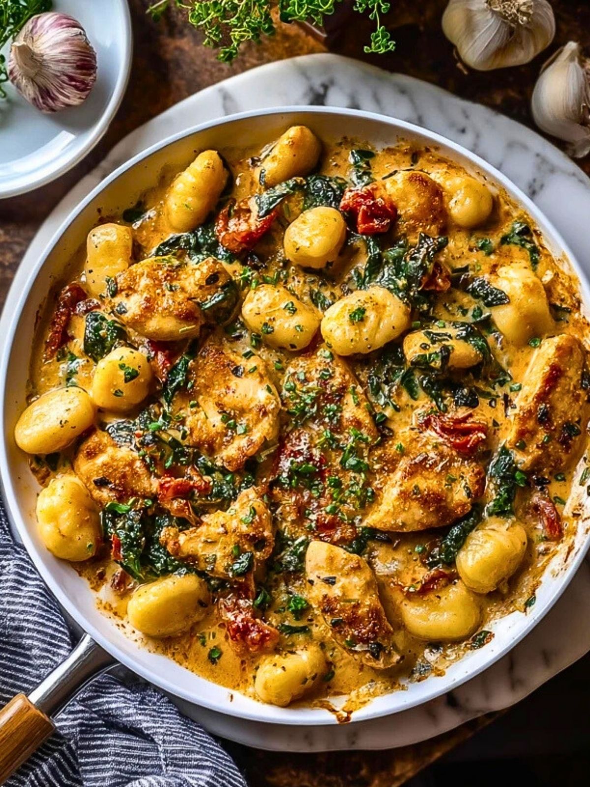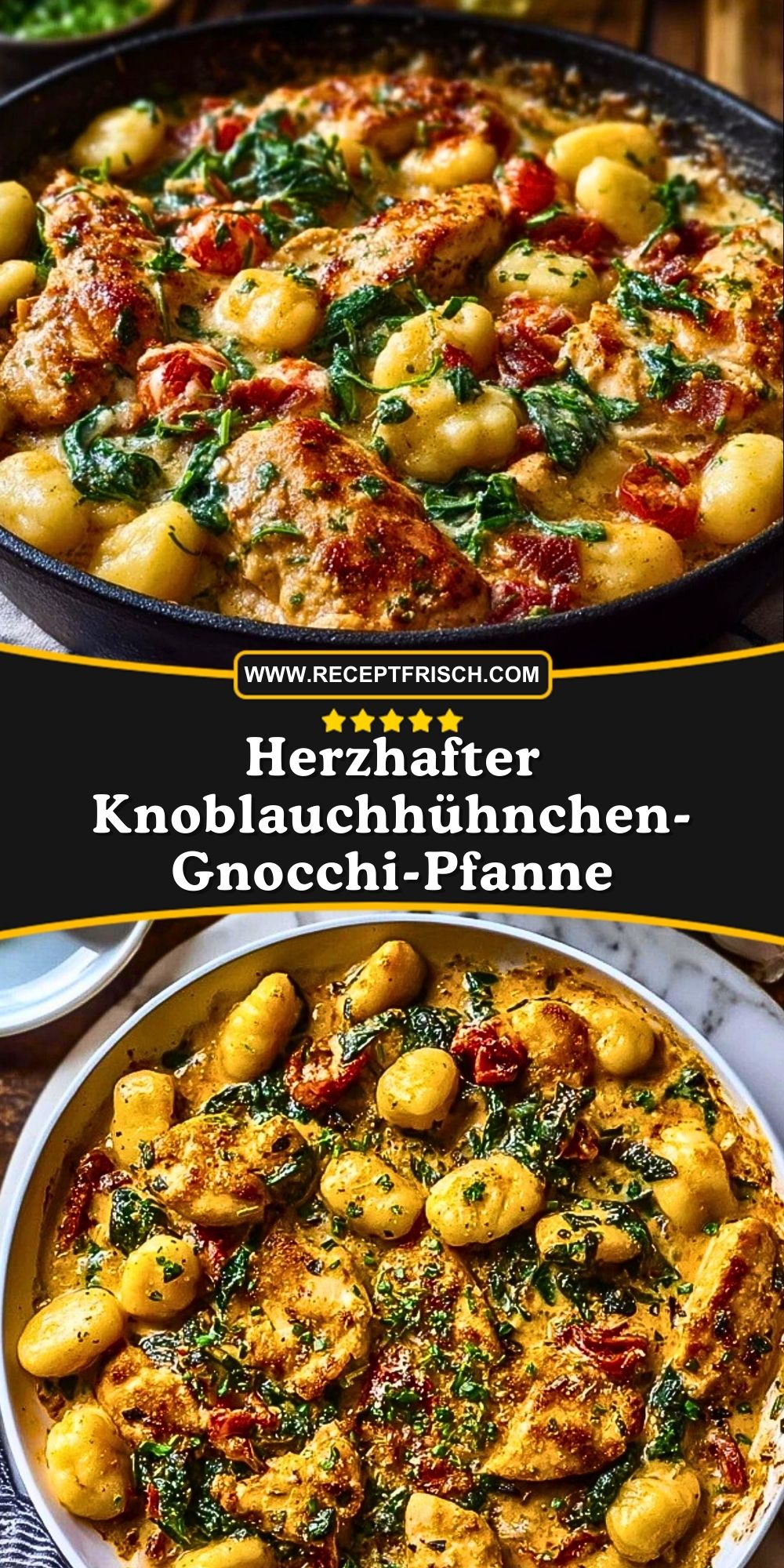 Herzhafte Knoblauchhühnchen-Gnocchi-Pfanne – ein cremiges Pfannengericht mit saftigen Hähnchenstücken, goldgelben Gnocchi, frischem Spinat und aromatischer Parmesan-Knoblauch-Sauce. Perfekt für ein schnelles Abendessen mit viel Geschmack und italienischem Flair!