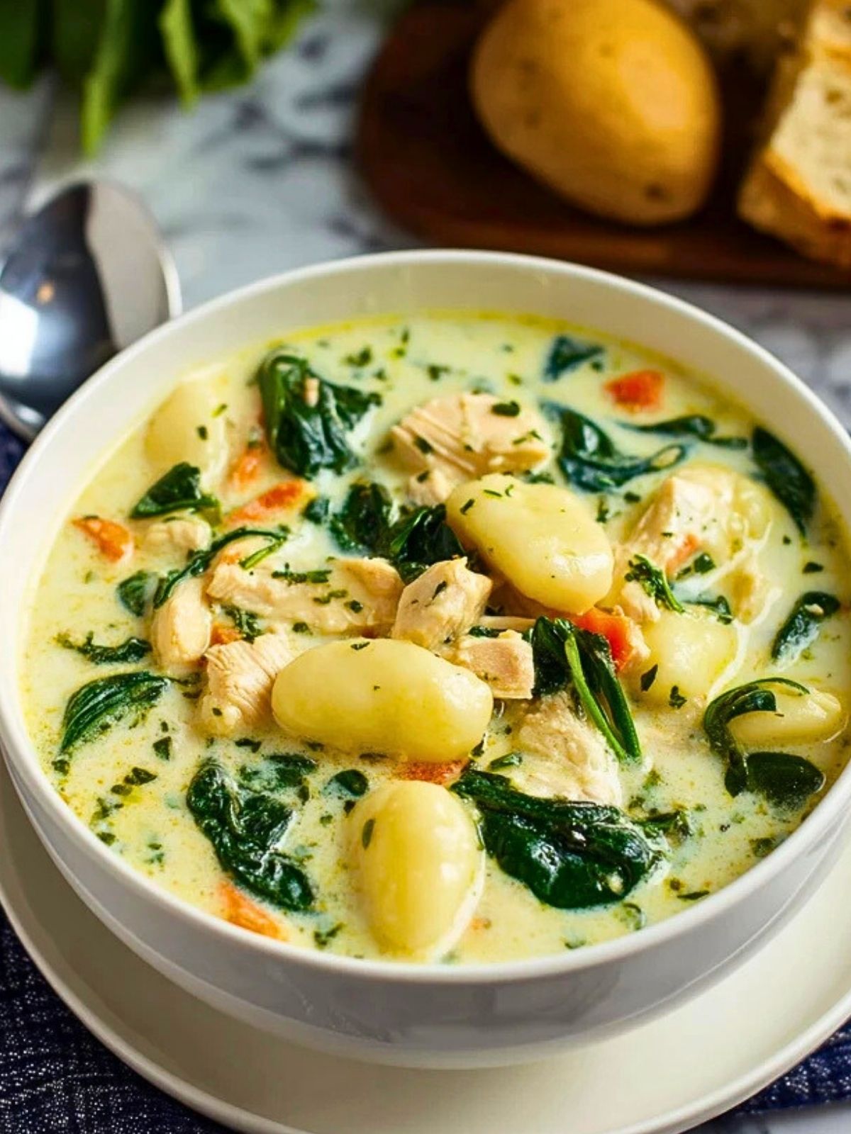 Cremig, wärmend und voller Geschmack – die Hühnchen-Gnocchi-Suppe ist ein Wohlfühlgericht für die ganze Familie. Zarte Gnocchi, zartes Hühnchenfleisch und frischer Blattspinat vereinen sich in einer milden, cremigen Brühe. Mit aromatischen Kräutern, feinem Gemüse und einer herrlich samtigen Konsistenz ist diese Suppe perfekt für kalte Tage, aber auch als herzhafte Mahlzeit unter der Woche.