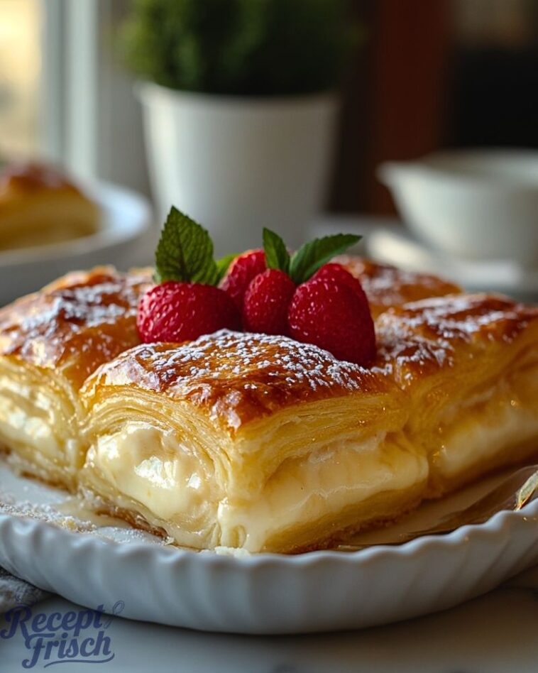 - Köstliche Texturen: Knuspriger Blätterteig trifft auf eine cremige Käsekuchenfüllung.