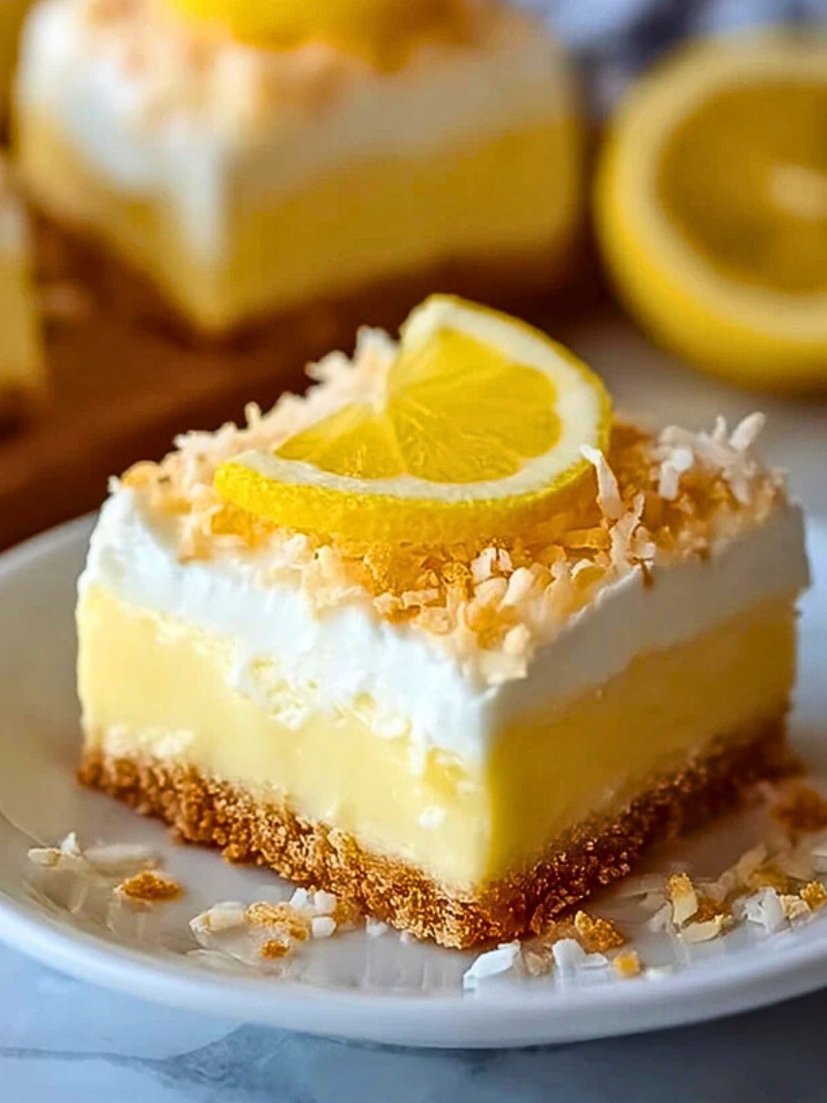 Kurz vor dem Servieren mit Kokosraspeln und optional Zitronenscheiben garnieren. Mit einem scharfen Messer in Riegel schneiden und gekühlt servieren.