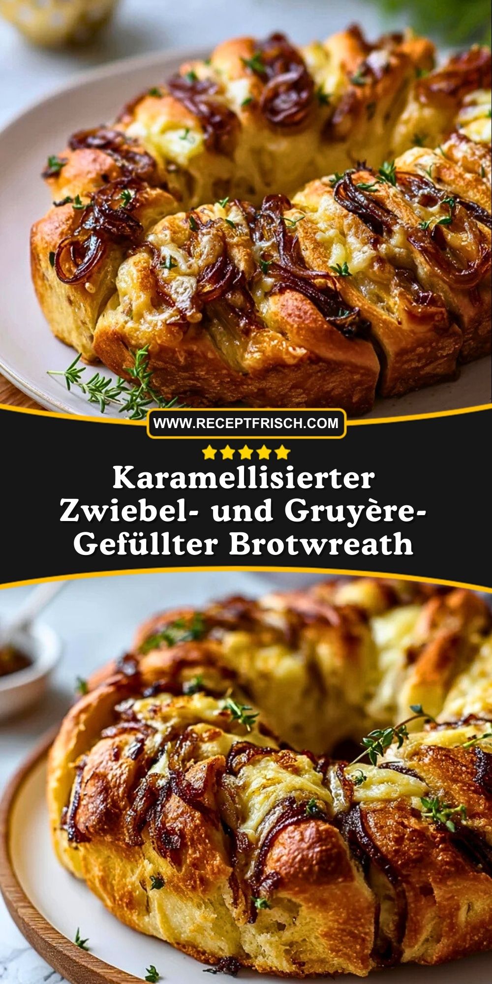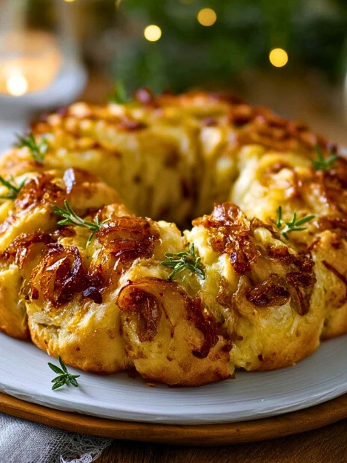Ein aromatischer, gefüllter Brotwreath mit karamellisierten Zwiebeln, würzigem Gruyère und frischen Kräutern. Perfekt zum Teilen, als Beilage oder zum Brunch – unwiderstehlich saftig und goldbraun gebacken.