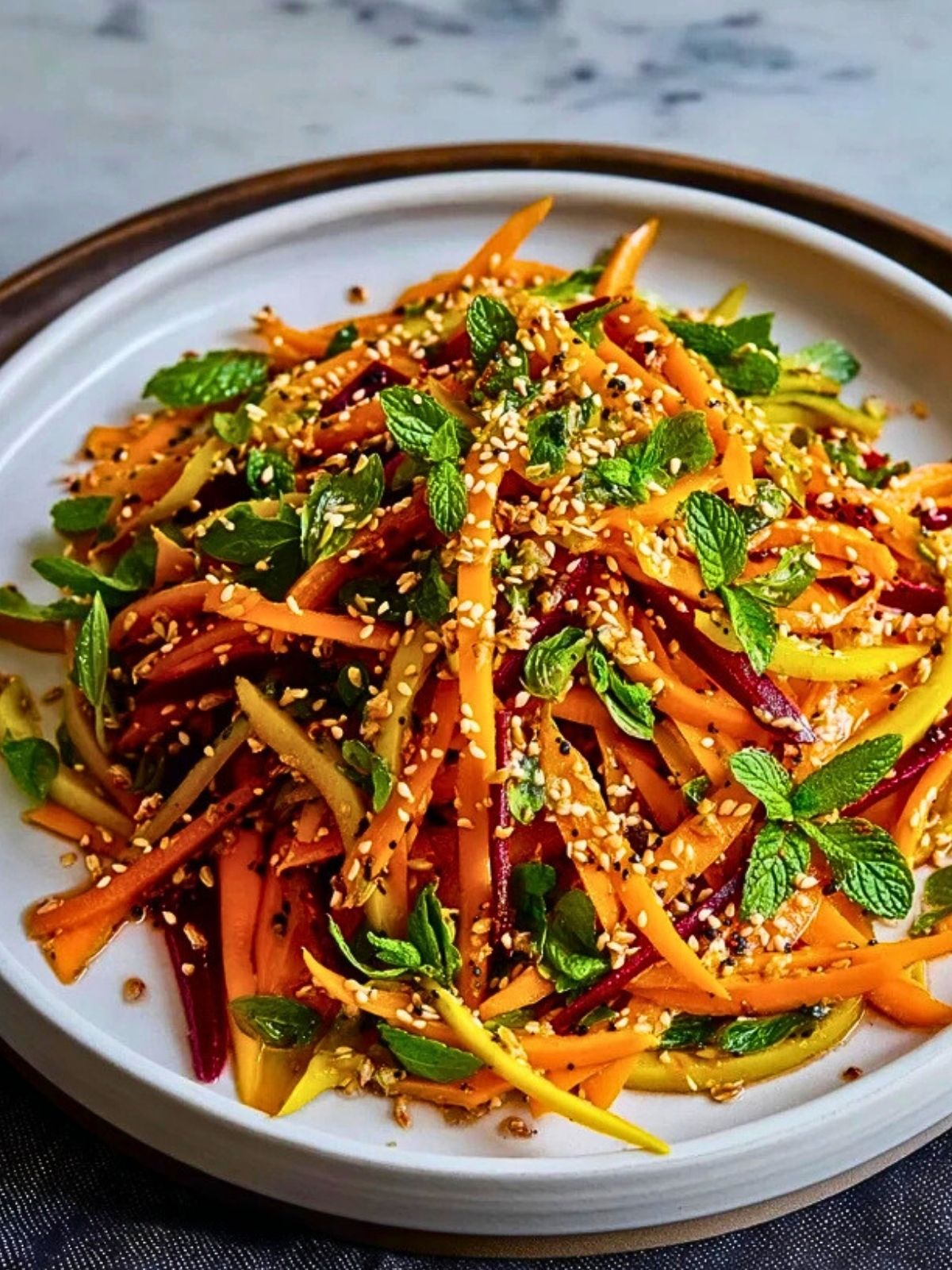 Knackig, bunt und voller Aromen: Der Karotten-Sesam-Salat ist eine wahre Vitaminbombe und bringt asiatisches Flair direkt auf deinen Teller. Die Kombination aus frischen Karotten, knackigen Zuckerschoten, süßer roter Bete und aromatischem Sesam sorgt für eine aufregende Textur und einen angenehm nussigen Geschmack. Perfekt als leichter Lunch, Beilage zum Grillen oder als bunter Farbklecks auf dem Buffet!