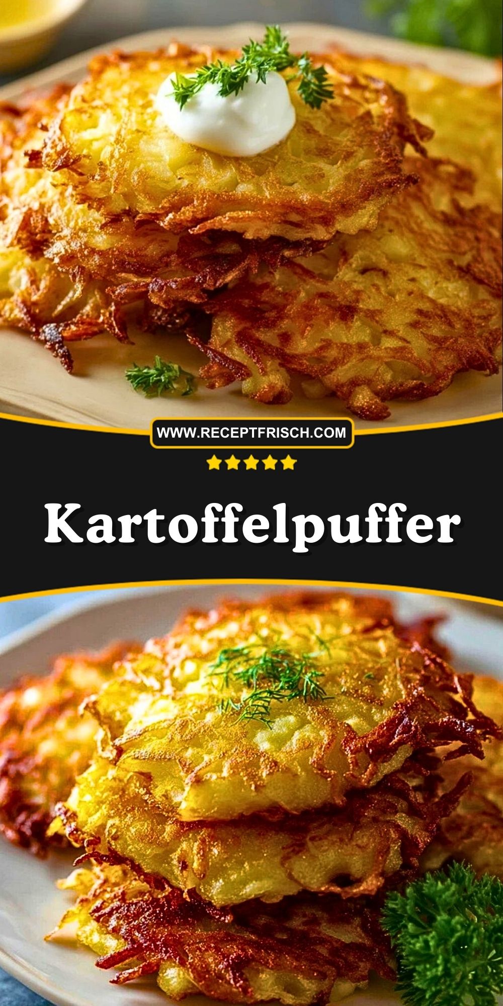 Kartoffelpuffer sind ein Klassiker der deutschen Küche: außen goldbraun und knusprig, innen herrlich saftig. Sie werden aus frisch geriebenen Kartoffeln, Zwiebeln, Ei und etwas Mehl hergestellt und traditionell mit Apfelmus oder Kräuterquark serviert. Ob als Hauptgericht, Beilage oder Snack – Kartoffelpuffer sind einfach und immer ein Genuss!