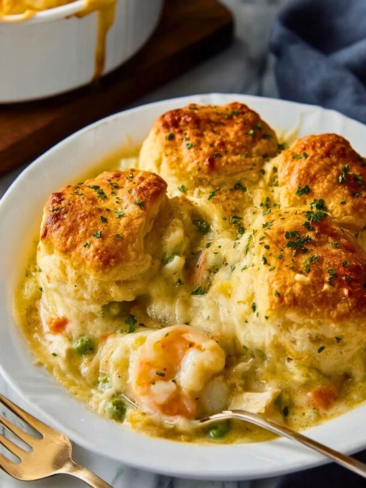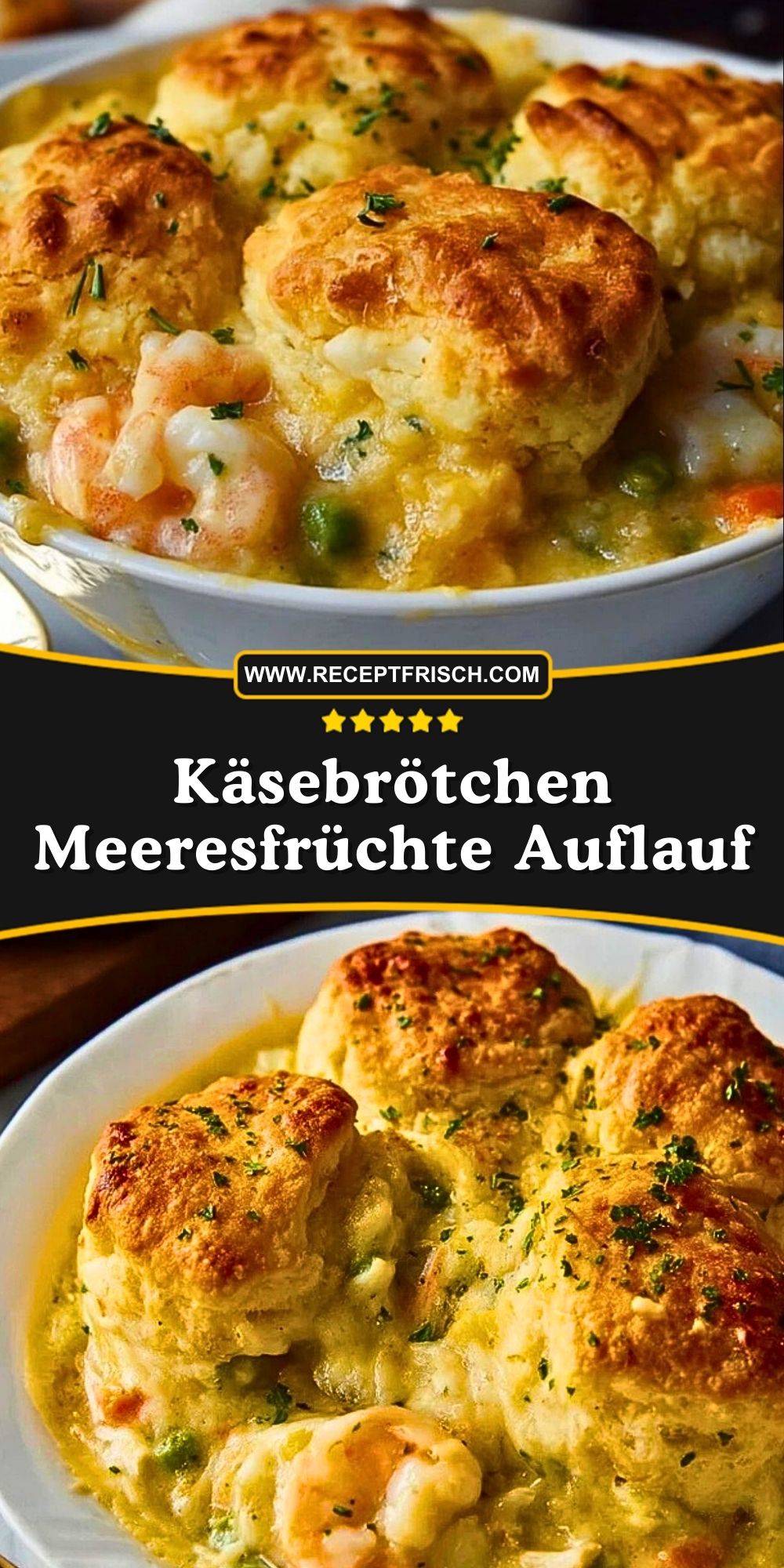 Würziger Auflauf aus zarten Meeresfrüchten in cremiger Sauce, getoppt mit fluffigen Käsebrötchen – ein festliches Ofengericht für besondere Anlässe oder als herzhaftes Soulfood.