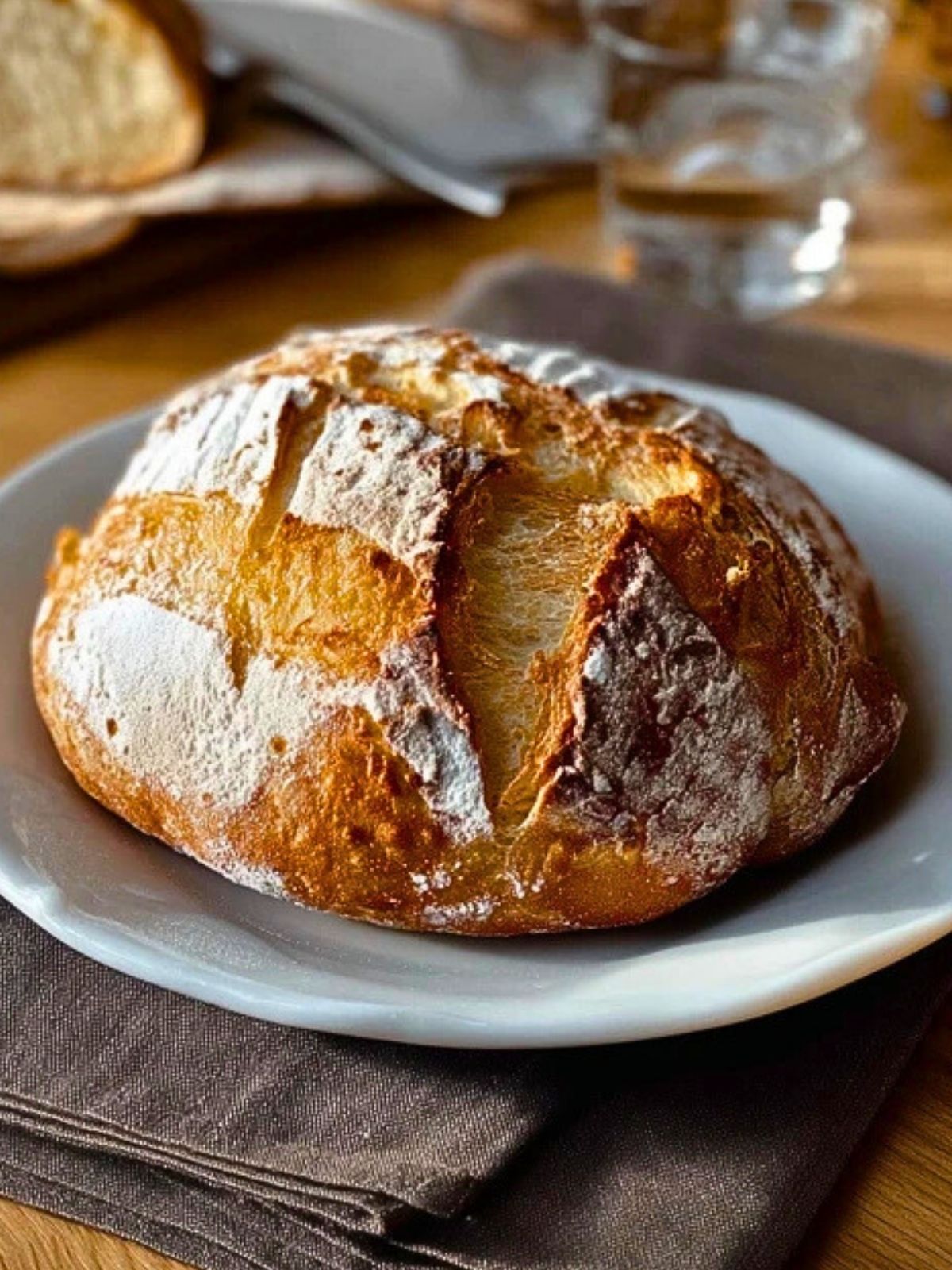 5. Backen: Ofen auf 250 °C vorheizen. Brot auf ein Blech oder in einen heißen Topf stürzen, einschneiden, 15 Minuten bei 250 °C, dann 30–35 Minuten bei 210 °C backen.