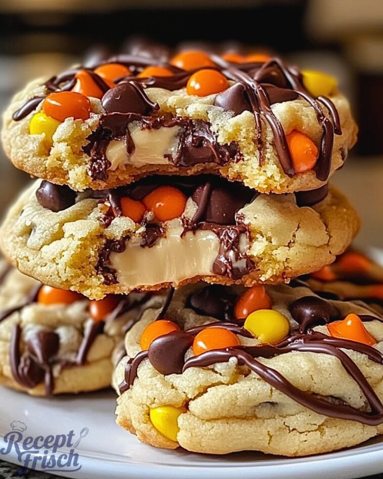 Für das perfekte Finish die Kekse mit geschmolzener Schokolade beträufeln und mit zusätzlichen Reese’s Pieces bestreuen. Anschließend vollständig auskühlen lassen, damit die Cheesecake-Füllung fest bleibt.