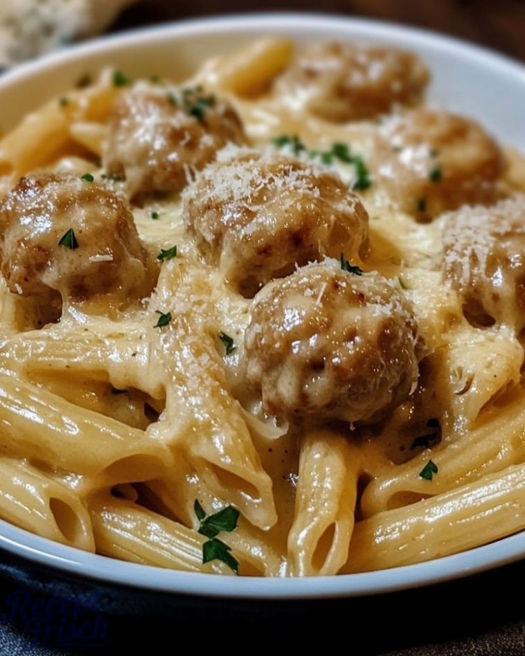 Saftige Knoblauchbutter-Fleischbällchen treffen auf eine cremige Parmesan-Sahnesauce und perfekt gekochte Penne. Dieses herzhafte Gericht vereint würzige Aromen mit einer samtigen Textur und eignet sich ideal für ein gemütliches Abendessen. Ein echter Genuss für Pasta- und Käseliebhaber!
