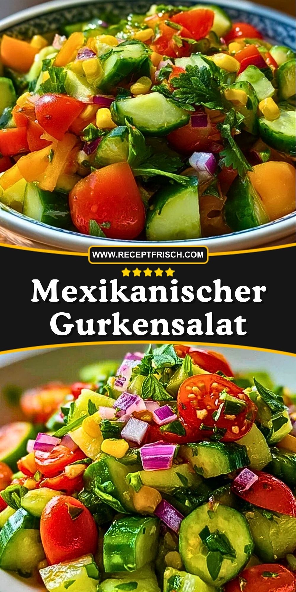 Mexikanischer Gurkensalat ist beliebt, weil er mit wenigen Zutaten ein Maximum an Geschmack liefert. Die knackige Frische von Gurken und Paprika harmoniert perfekt mit süßem Mais und der Würze von Zwiebeln und Koriander. Das leichte Dressing mit Limettensaft rundet alles ab und macht den Salat besonders erfrischend – perfekt für warme Tage oder als bunte Ergänzung zu herzhaften Hauptgerichten.