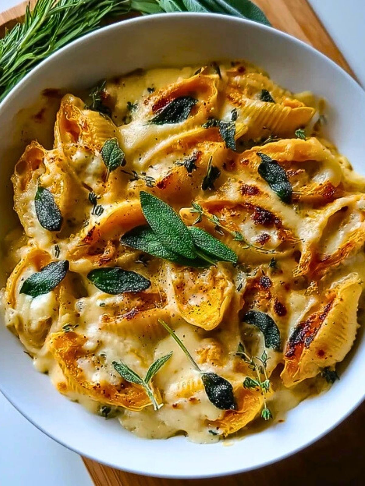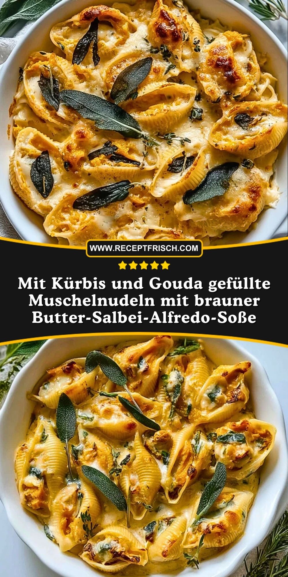 Kürbis bringt eine natürliche Süße und Cremigkeit mit, während Gouda für Würze und Schmelz sorgt. Gemeinsam füllen sie die Muschelnudeln üppig, ohne schwer zu wirken. In Verbindung mit der nussigen Salbei-Alfredo-Soße entsteht ein rundes Aroma, das perfekt in die kühle Jahreszeit passt. Außerdem sind beide Zutaten in Deutschland einfach erhältlich und passen ideal zu Pasta.
