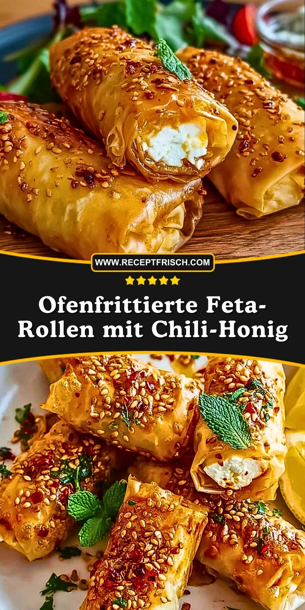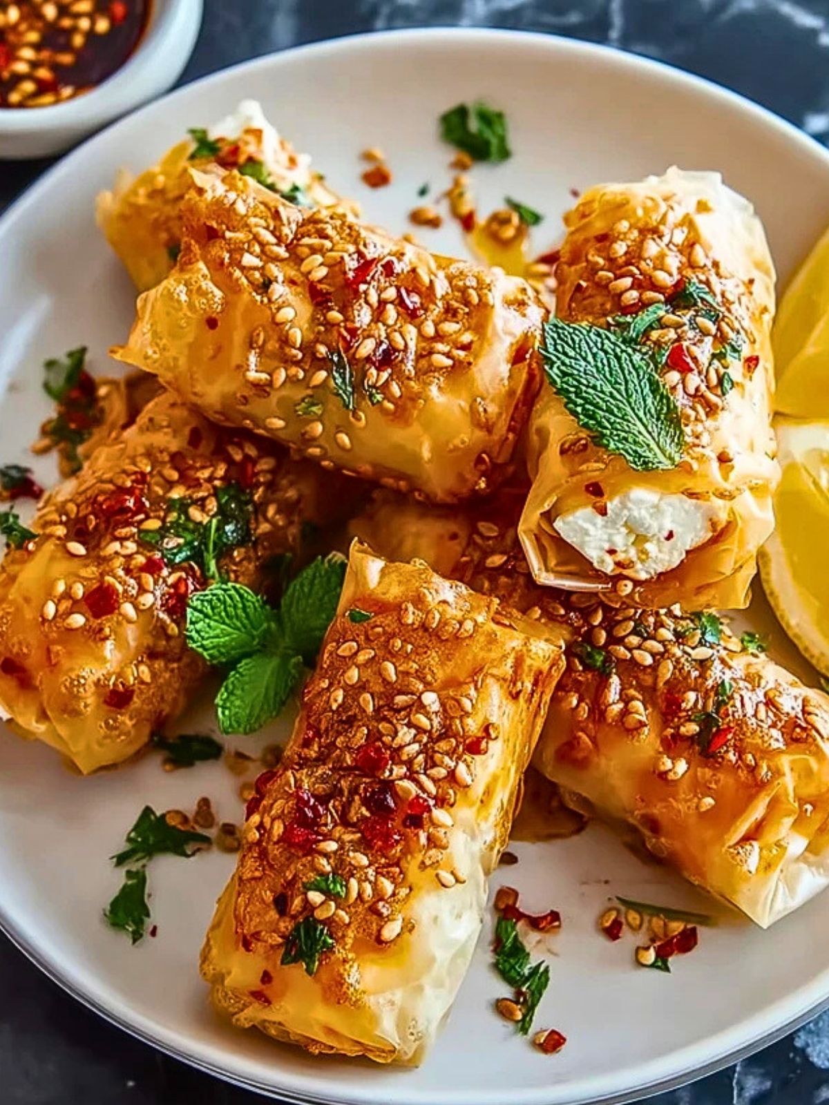 Knusprige Filoteigrollen mit cremig-würziger Feta-Frischkäse-Füllung, verfeinert mit frischer Minze, geröstetem Sesam und einem pikant-süßen Chili-Honig. Perfekt als Fingerfood, Vorspeise oder Highlight für jede Party!