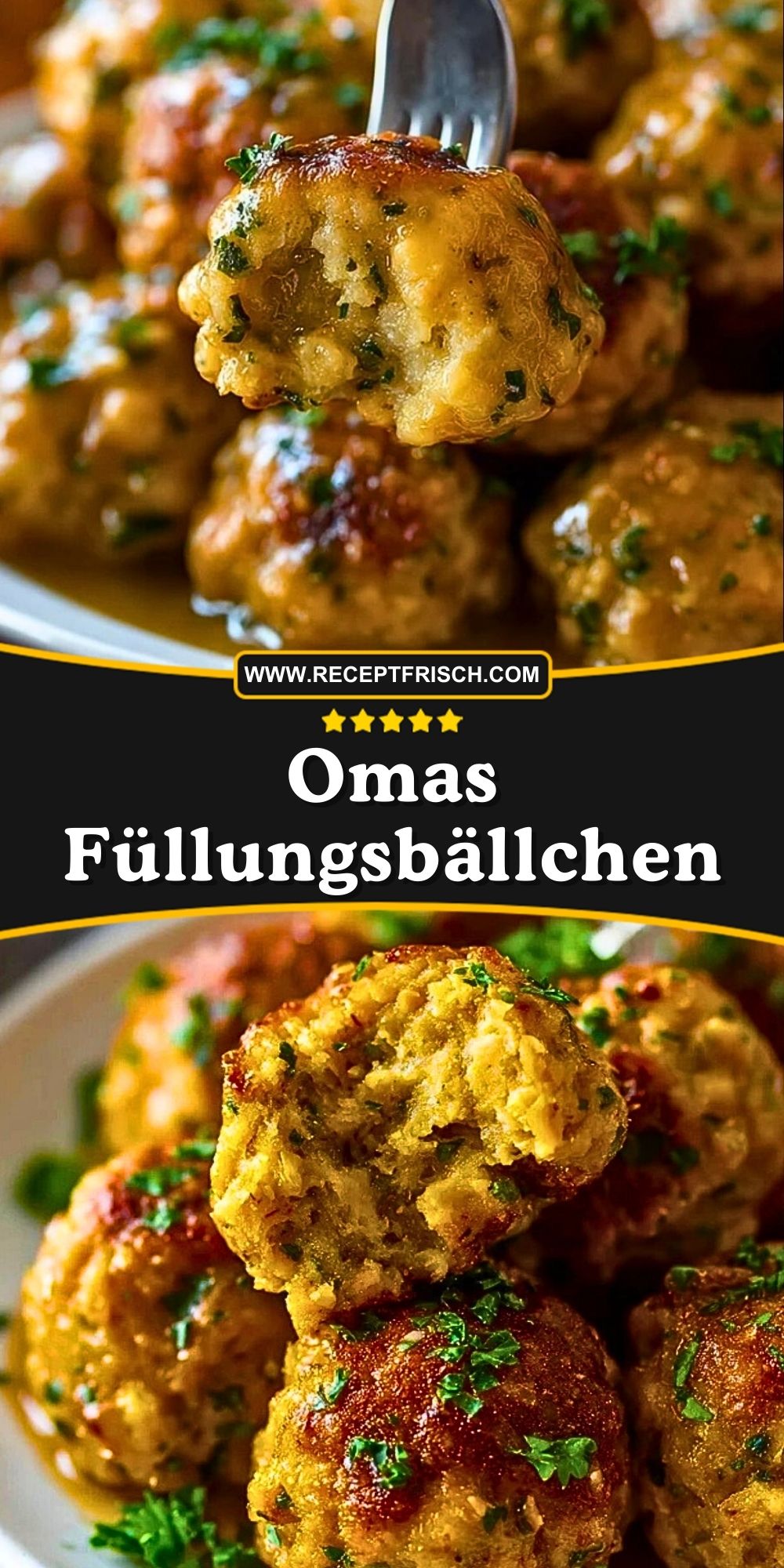 Omas Füllungsbällchen schmecken frisch am besten, lassen sich aber auch sehr gut vorbereiten und aufwärmen. Im Kühlschrank halten sie sich 2–3 Tage, am besten in einem luftdichten Behälter. Zum Aufwärmen einfach kurz in der Pfanne mit etwas Butter schwenken oder im Ofen erwärmen. Sie passen hervorragend zu Braten, Geflügel oder vegetarischen Soßen. Auch kalt, z. B. als Snack, sind sie ein Genuss!