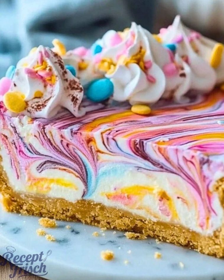 Ein farbenfroher Oster-Wirbelkuchen ohne Backen! Der knusprige Keksboden trifft auf eine cremige Frischkäsefüllung, die mit bunten Farben marmoriert wird. Perfekt für die Osterzeit und ein echter Hingucker auf der Festtafel. Einfach in der Zubereitung und wunderbar erfrischend!