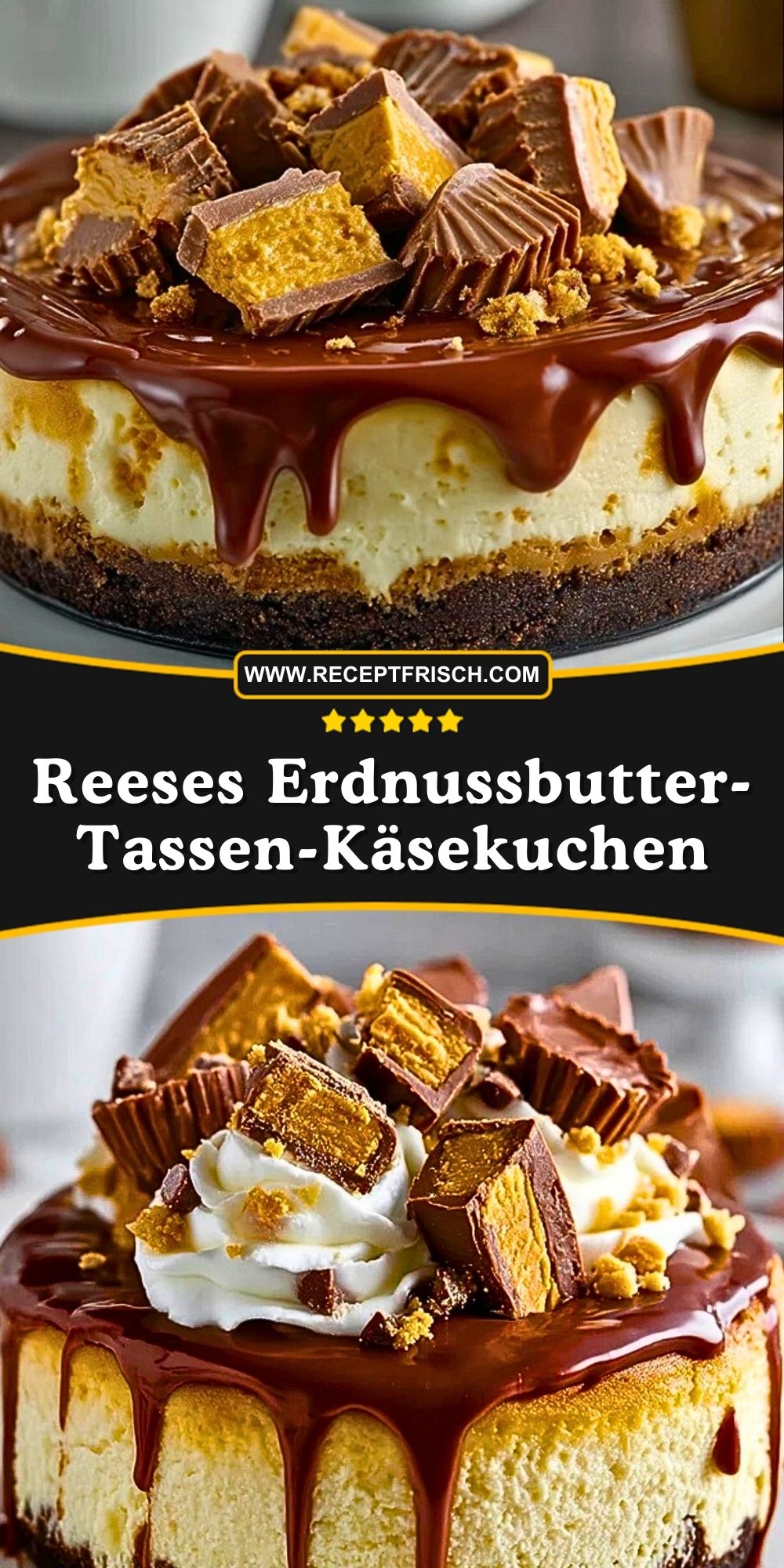 Cremiger Käsekuchen auf Keksboden, gefüllt mit gehackten Reeses Erdnussbutter-Tassen, überzogen mit zartschmelzender Schokoladenglasur und getoppt mit Sahne und Karamell – ein unwiderstehliches Highlight für alle Schoko- und Erdnussfans.
