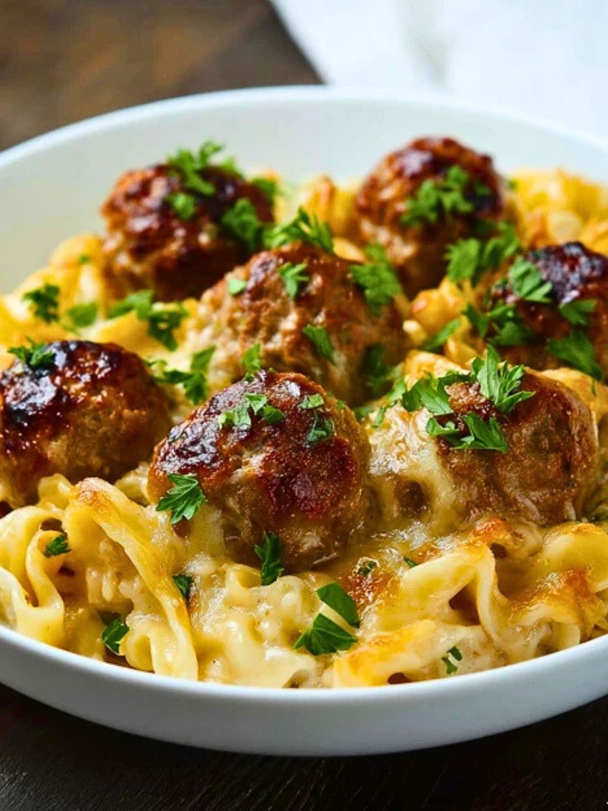 Ein schwedisch inspirierter Nudelauflauf mit saftigen Hackbällchen, cremiger Sauce und einer goldenen Käsekruste – perfekt für die ganze Familie oder zum Vorkochen!