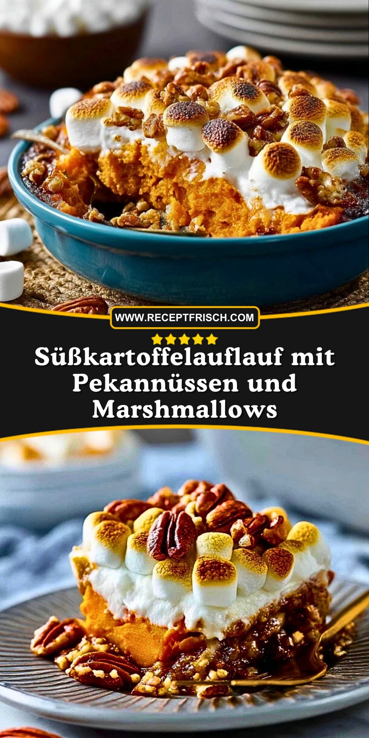Ein cremiger Süßkartoffelauflauf mit einer knusprigen Pekannuss-Streuselschicht und goldbraunen Marshmallows. Perfekt als festliches Dessert oder ausgefallene Beilage zu besonderen Anlässen. Die Kombination aus zartem Püree, nussigem Crunch und süßem Topping bringt amerikanisches Flair auf den deutschen Tisch.