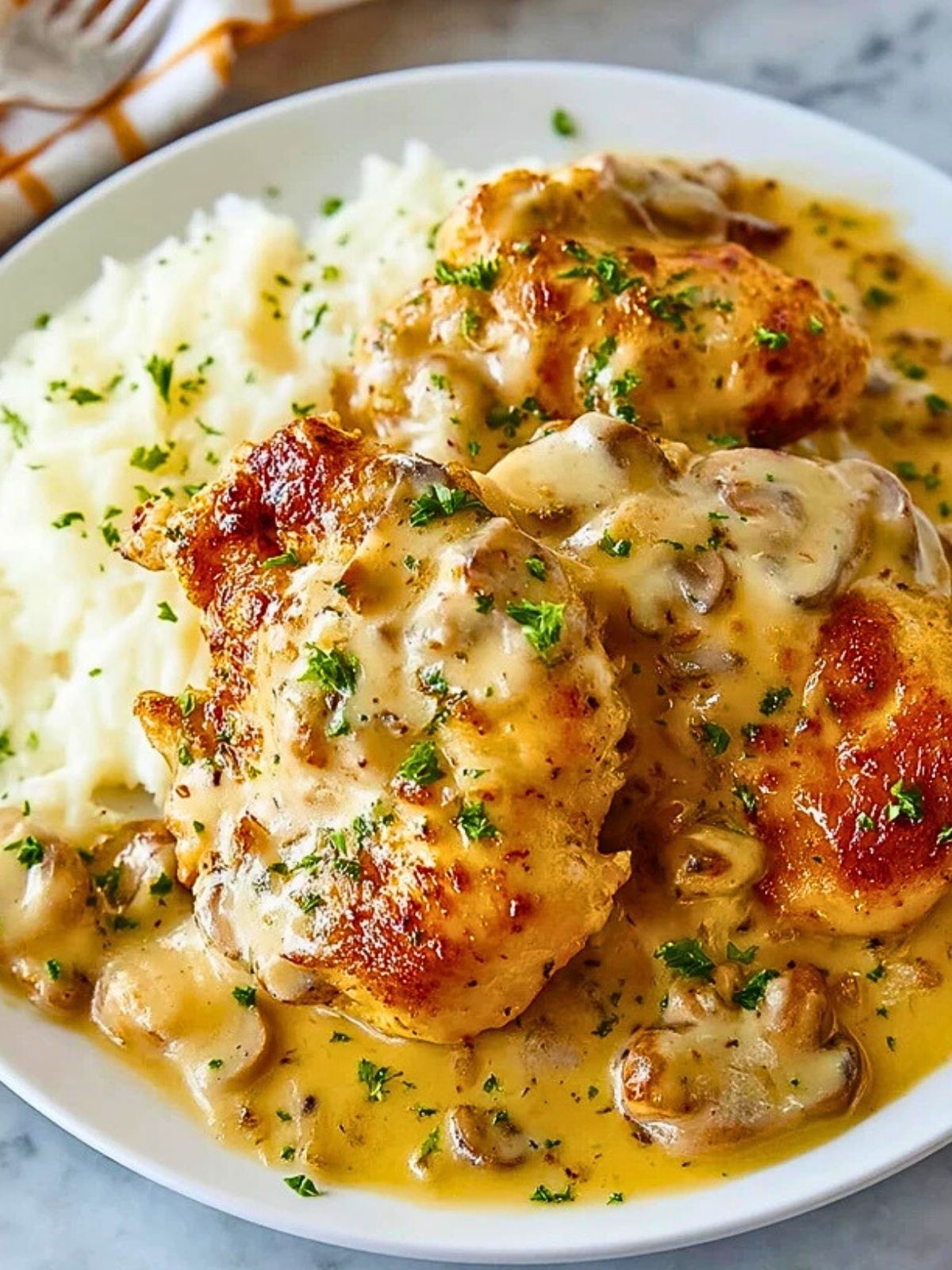 Die Kombination aus knusprig angebratenem Hähnchen, cremiger Pilzsoße und geschmolzenem Käse macht dieses Gericht zu einem echten Wohlfühlessen. Durch das Überbacken bleibt das Fleisch besonders saftig und nimmt die Aromen der Soße und des Käses wunderbar auf – ein Muss für alle Fans herzhafter Ofengerichte!