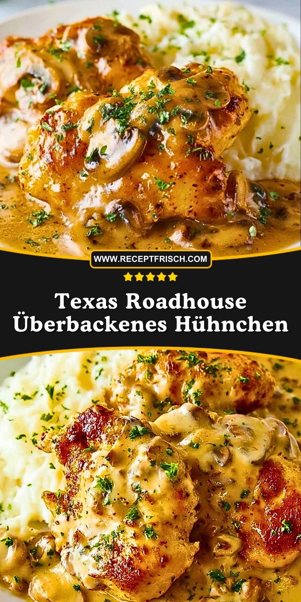 Zartes Hähnchenbrustfilet, goldbraun angebraten und mit einer herrlich cremigen Pilz-Sahnesoße übergossen – das ist das legendäre Texas Roadhouse Überbackenes Hühnchen, das Genießerherzen höher schlagen lässt. Saftiges Fleisch trifft auf eine würzige Soße, verfeinert mit frischen Champignons und einer feinen Käseschicht, die dem Gericht eine unwiderstehliche Note verleiht. Dieses Rezept bringt das beliebte amerikanische Wohlfühlgericht direkt in deine deutsche Küche und sorgt für einen echten Restaurant-Genuss zu Hause.