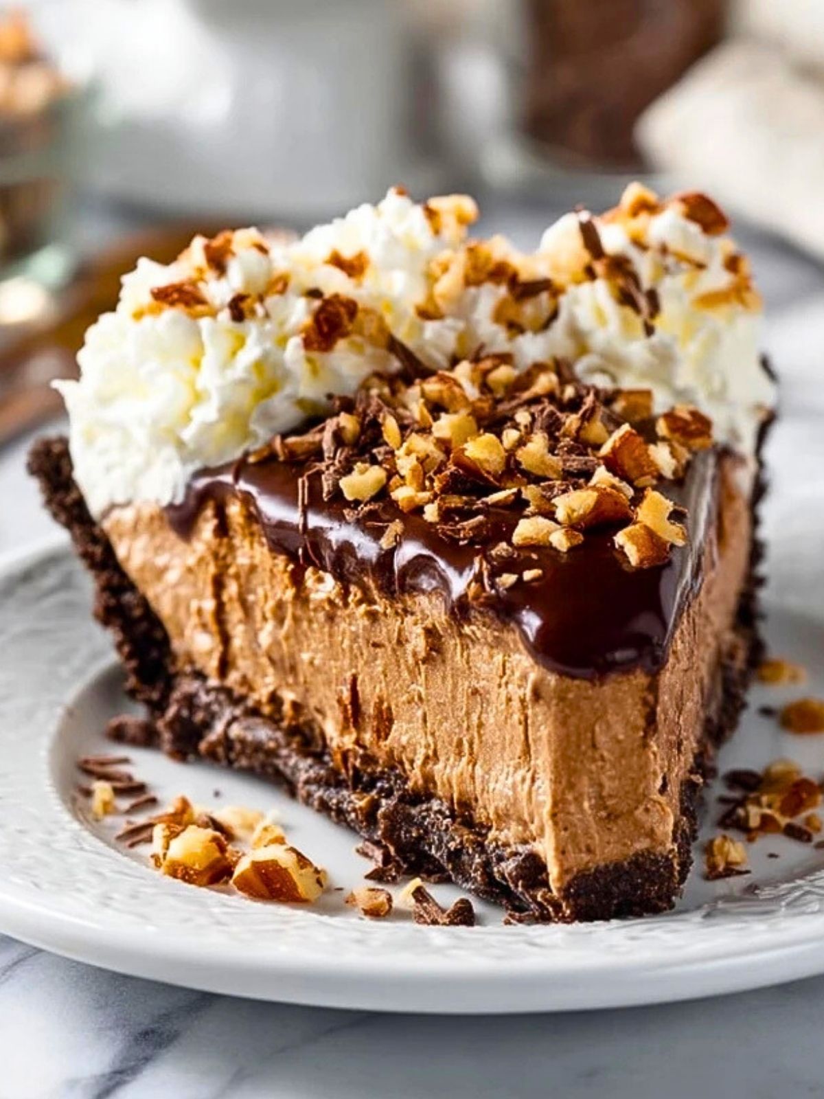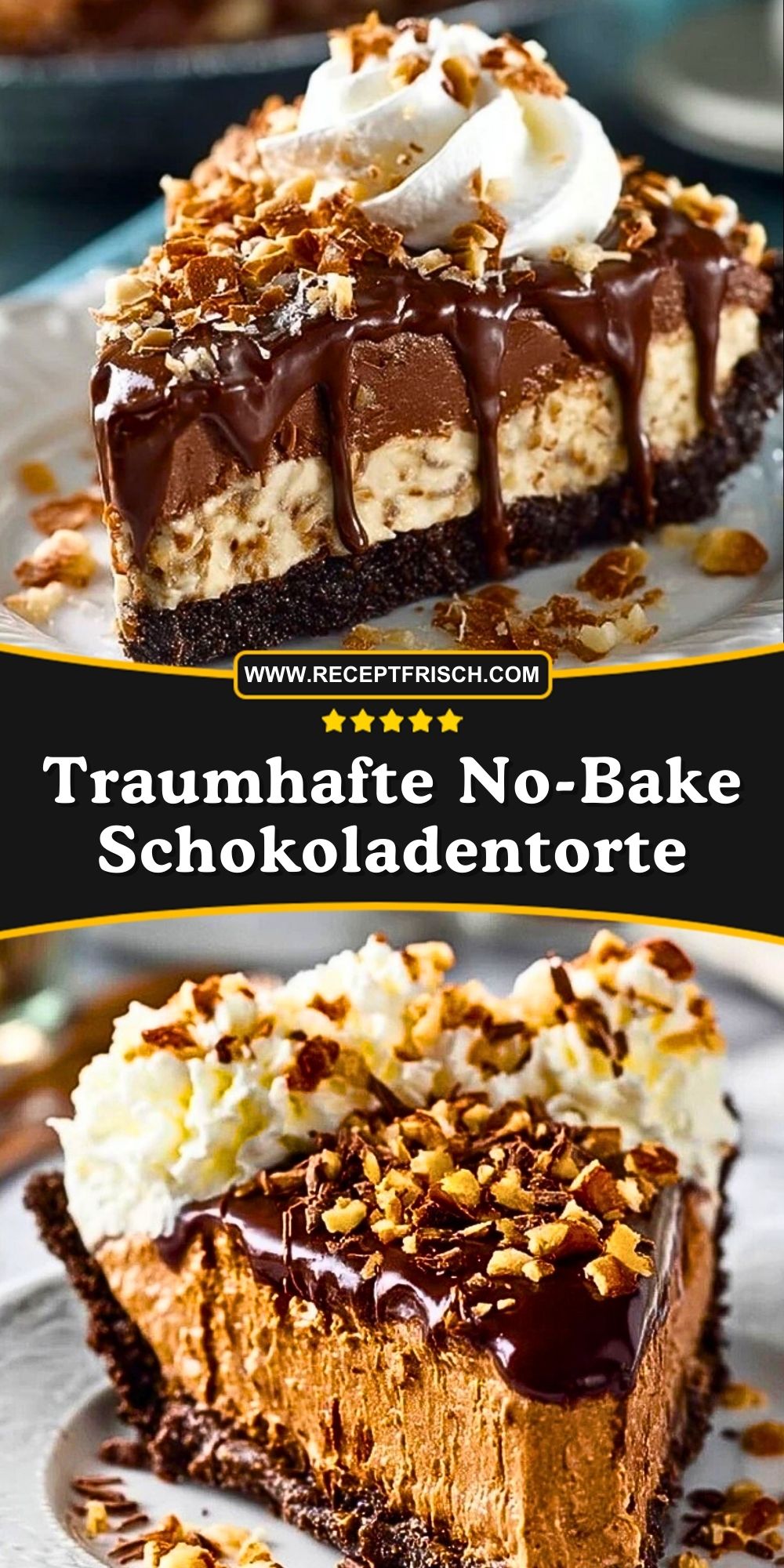 Die Kombination aus knackigem Schokoladenkeksboden, einer luftigen, schokoladigen Mousse-Schicht und einer Schokoladenglasur mit knackigen Nüssen sorgt für ein wahres Geschmackserlebnis. Wer Schokolade liebt, wird diese Torte nicht mehr missen wollen – sie ist einfach gemacht, wunderbar vorzubereiten und beeindruckt garantiert alle Gäste.
