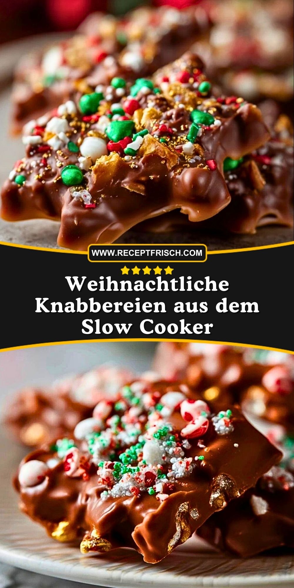 Wenn es draußen kalt und festlich wird, gibt es kaum etwas Schöneres, als sich mit selbstgemachten Leckereien zu verwöhnen. Mit dem Slow Cooker kannst du köstliche, schokoladenüberzogene Weihnachts-Knabbereien ganz entspannt und fast ohne Aufwand zaubern. Perfekt für gemütliche Nachmittage, als Geschenk aus der Küche oder für das Adventsbuffet! Die Kombination aus knackigen Nüssen, Salzbrezeln, Keksen und einer ordentlichen Portion Schokolade sorgt für das gewisse Etwas – und durch die bunte Streudeko kommt direkt Weihnachtsstimmung auf.