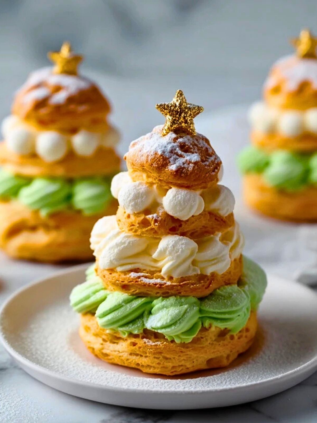 Zarte Windbeutel aus Brandteig, gefüllt mit einer luftig-leichten Pistaziencreme und kunstvoll zu kleinen Weihnachtsbäumen gestapelt – dieses Dessert ist ein echter Hingucker auf jeder Adventstafel. Die Kombination aus knusprigem Teig und sahniger Füllung sorgt dafür, dass nicht nur Kinderaugen strahlen.
