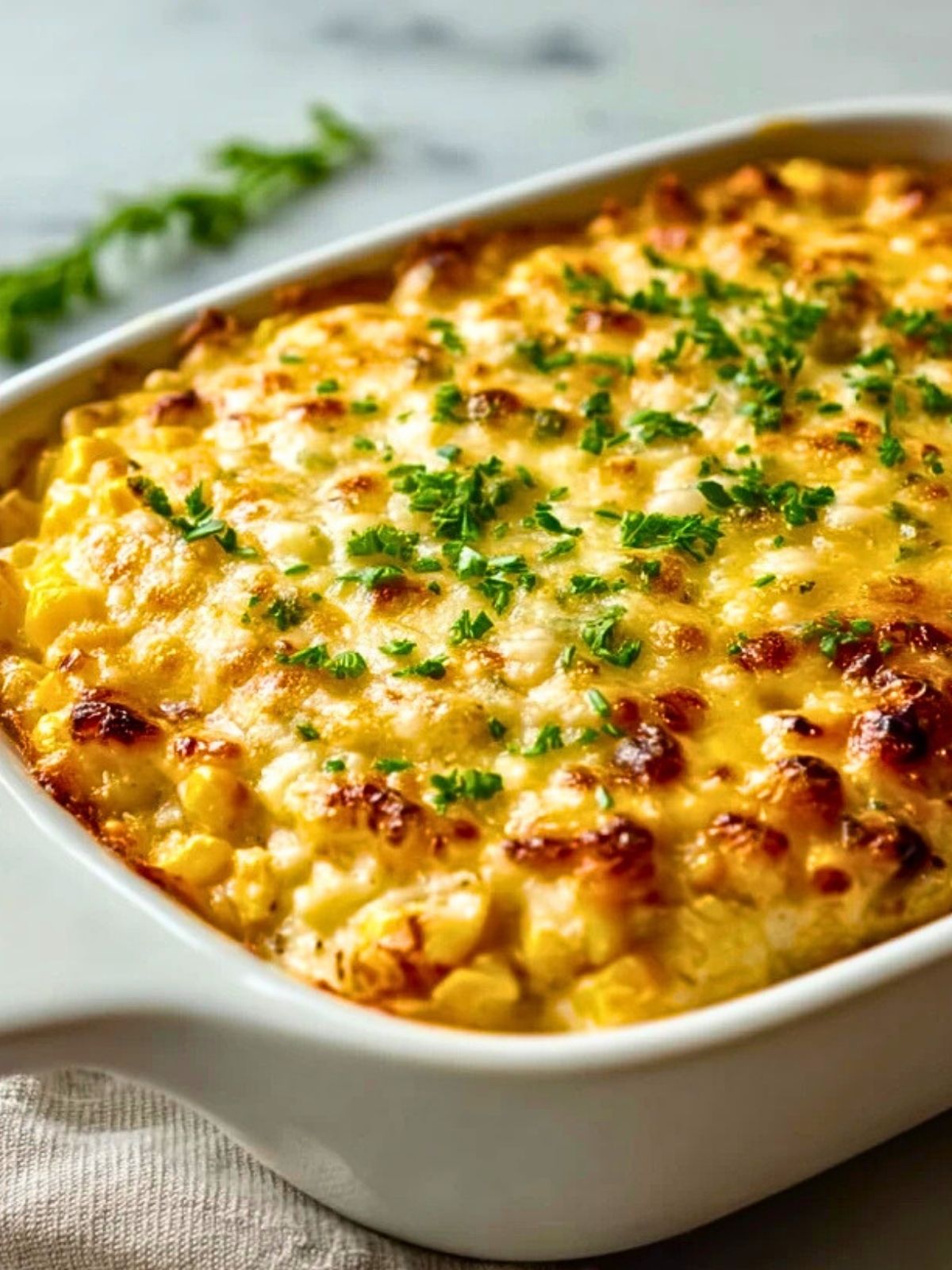 Ein cremiger, würziger Auflauf mit süßem Mais und geschmolzenem weißem Cheddar, abgerundet mit frischen Kräutern. Perfekt als Beilage oder Hauptgericht, schnell gemacht und absolut gelingsicher!