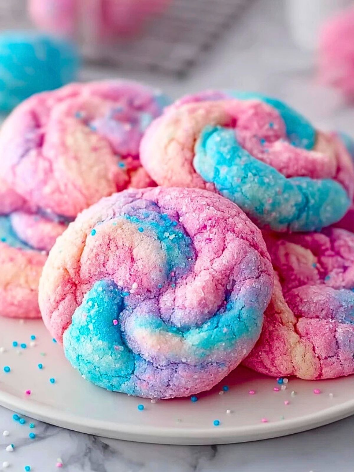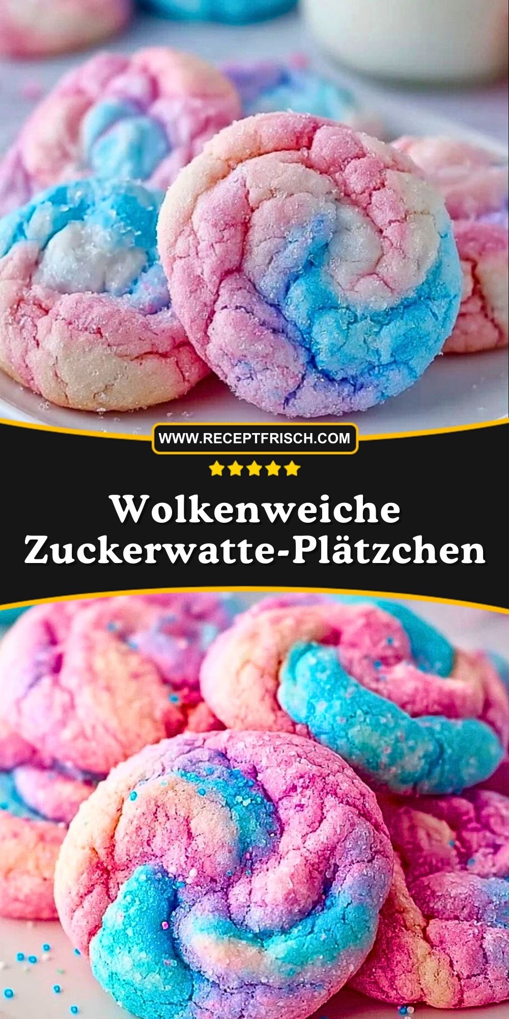 Luftig-weiche Plätzchen mit zartem Zuckerwatte-Aroma, pastellfarben marmoriert und mit funkelnden Zuckerperlen verziert – ein himmlisches Highlight für jede Gelegenheit!