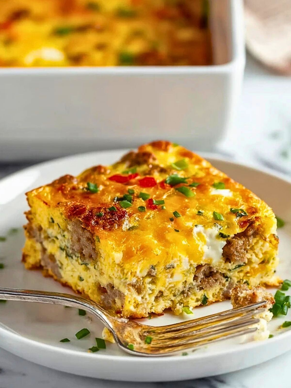 Serviere den Wurst-, Ei- und Rösti-Frühstücksauflauf warm, direkt aus der Form geschnitten. Ein frischer Blattsalat oder etwas Schnittlauch als Topping passen hervorragend dazu.