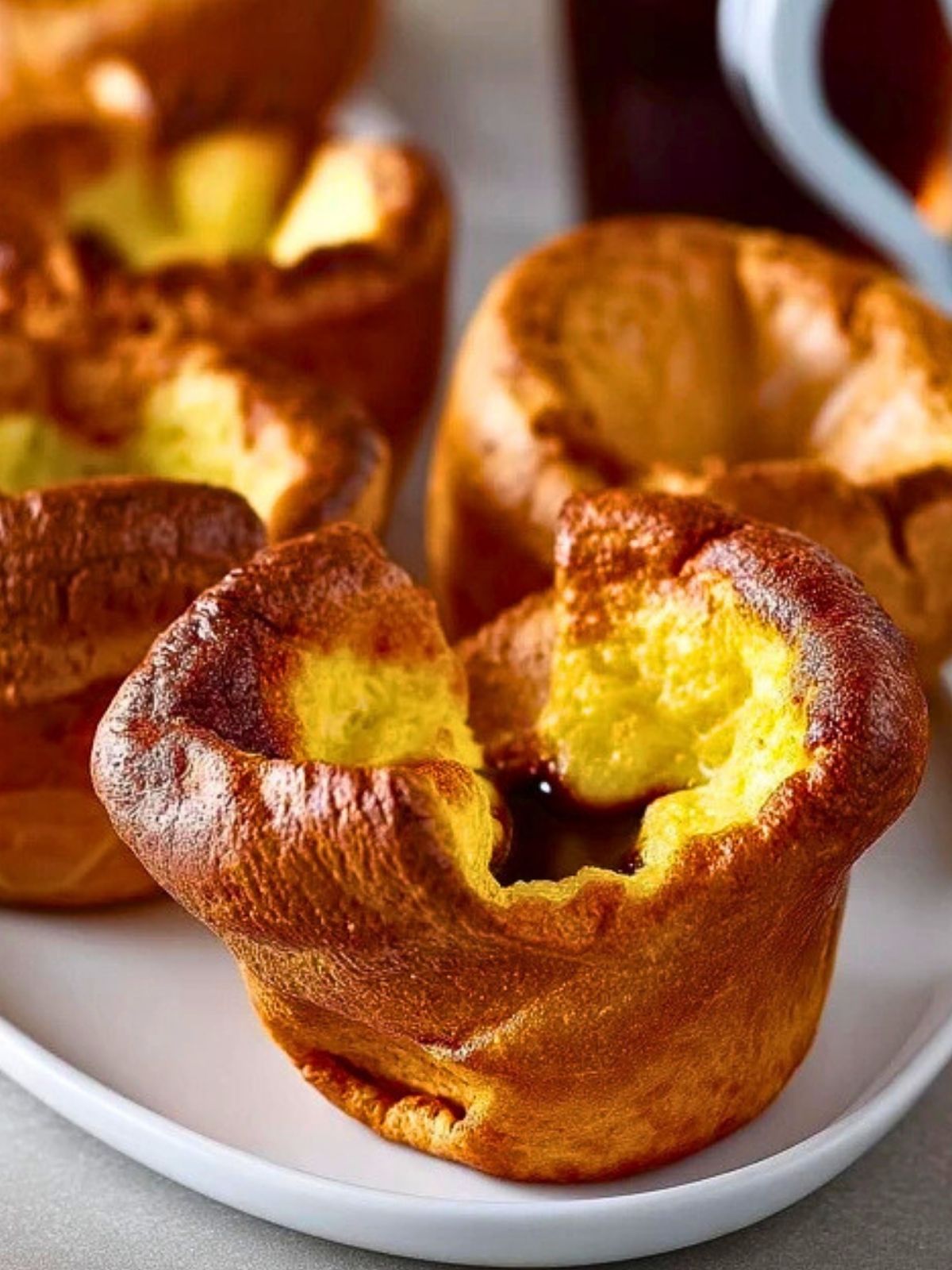 Die fertigen Yorkshire Puddings sofort aus der Form nehmen und noch heiß servieren – am besten zu Braten und kräftigen Soßen.
