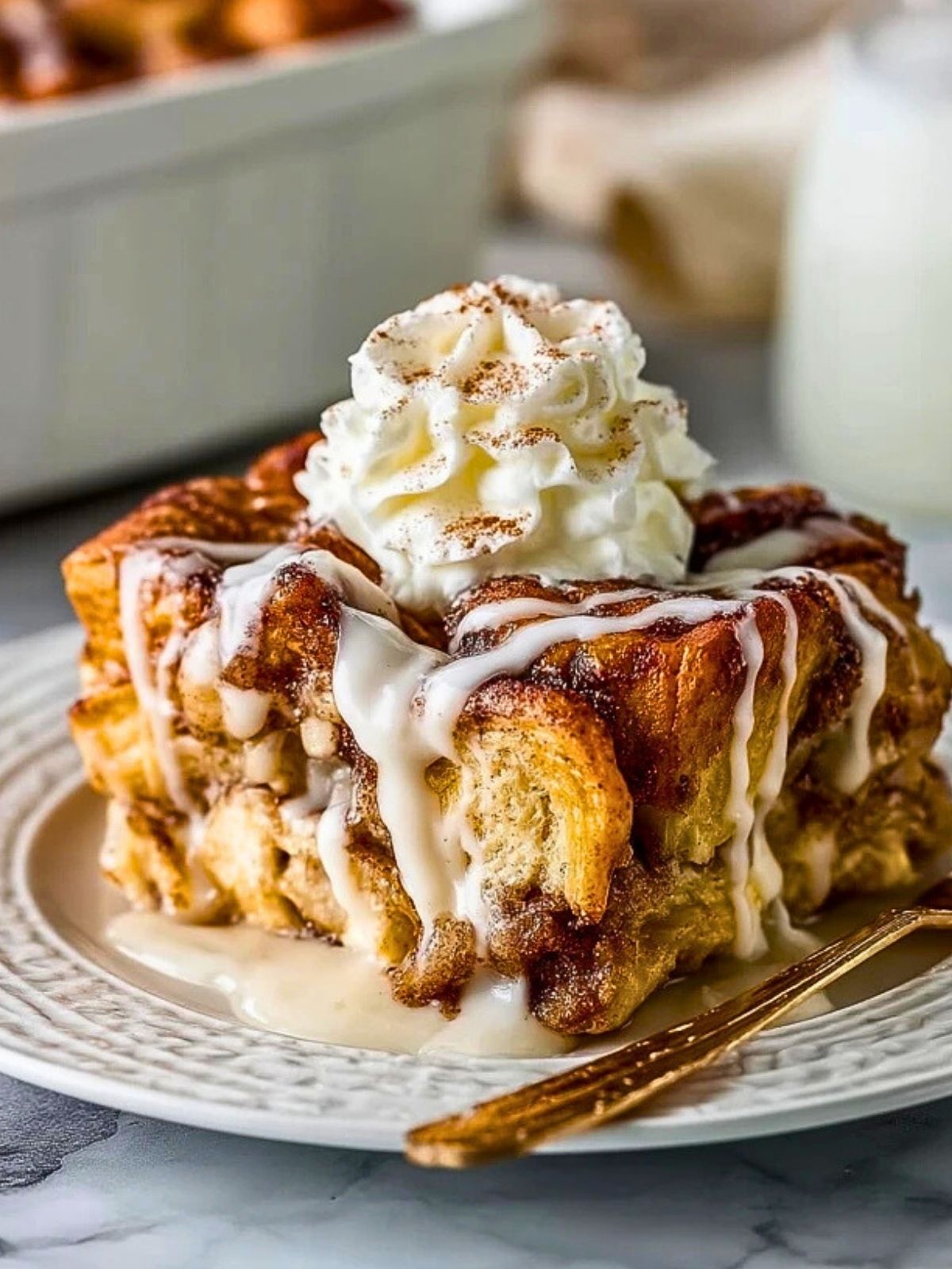 Am besten schmeckt der Zimtrollen Auflauf frisch und noch leicht warm, wenn die Glasur sanft geschmolzen ist. Dazu passt eine Tasse Kaffee oder ein Glas Milch.