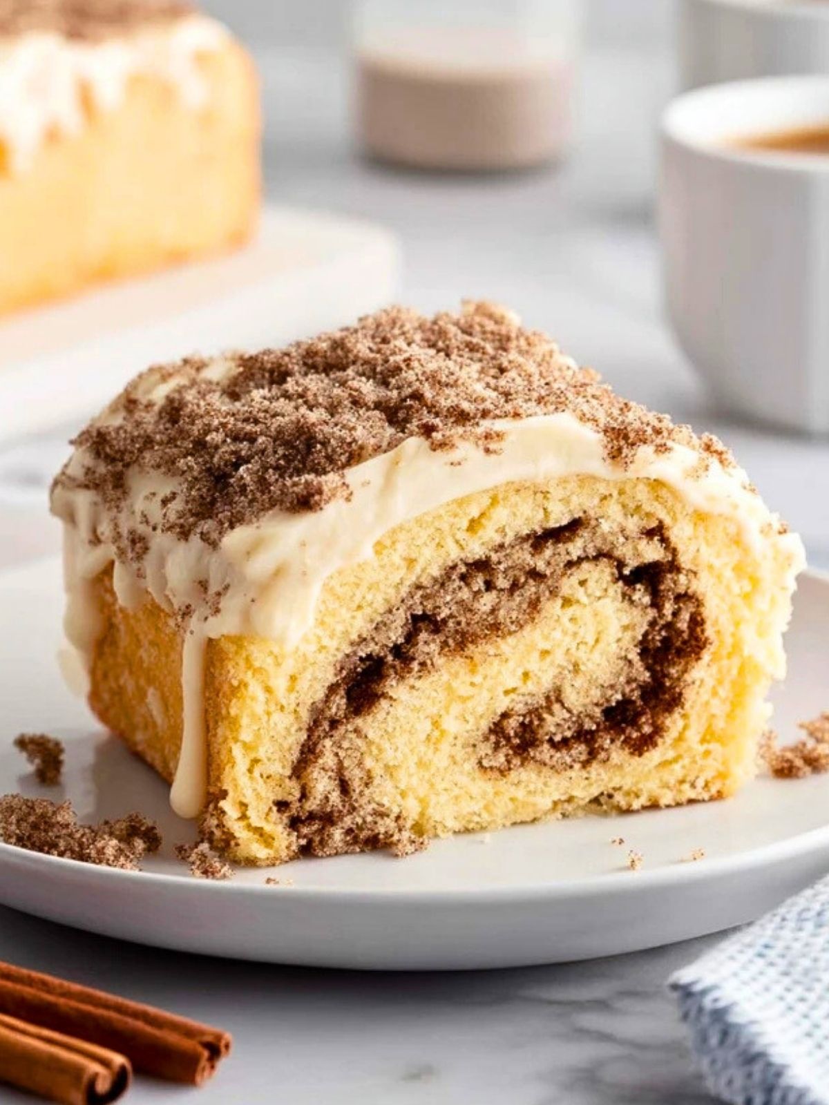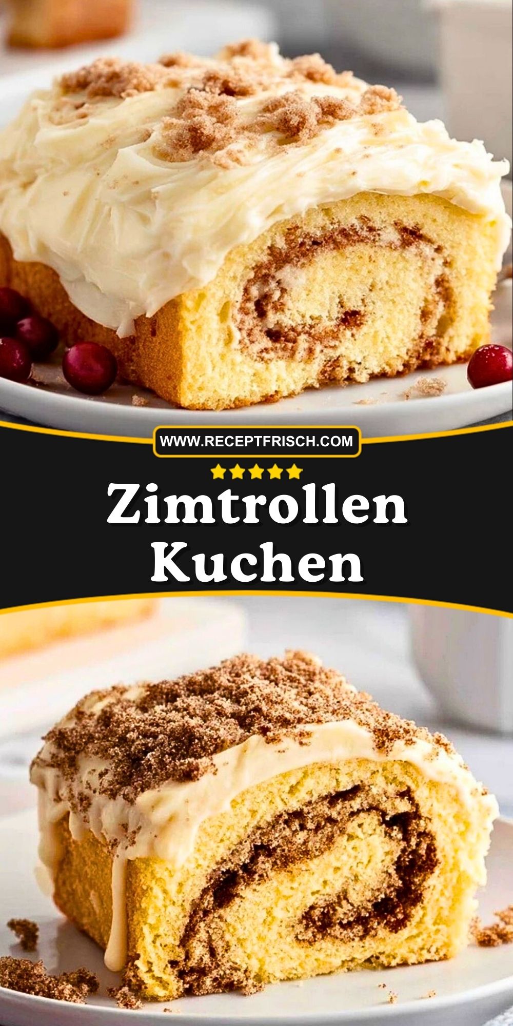 Saftiger Zimtrollen Kuchen mit typischem „Cinnamon Roll“-Swirl, gekrönt von cremigem Frischkäse-Frosting. Einfach gemacht, herrlich aromatisch – perfekt für jede Kaffeetafel.