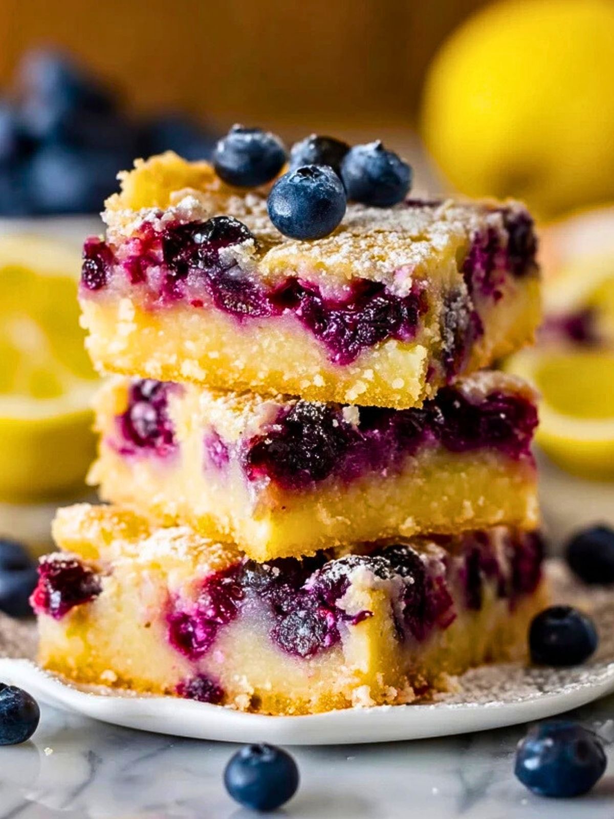 Saftige Zitronen-Blaubeer-Bars mit frischem Zitronensaft und aromatischem Abrieb. Die Kombination aus lockerem Rührteig und fruchtigen Blaubeeren sorgt für eine perfekte Balance aus Süße und angenehmer Säure – ideal zum Nachmittagskaffee oder als sommerliches Dessert vom Blech.
